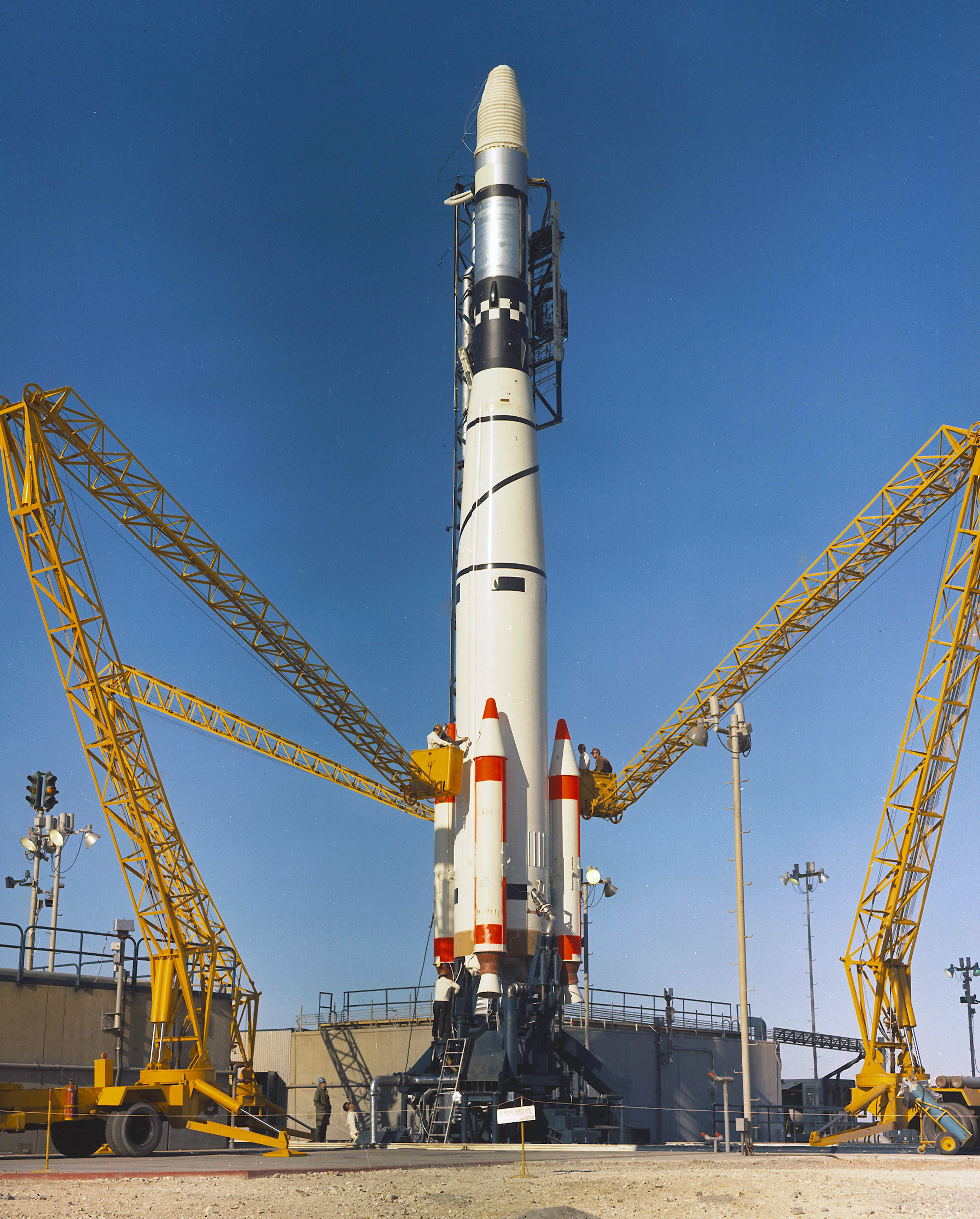 Fig. 1 : Mise en place de l'étage Agena D sur le Thor SLV-2A. Très similaire au Thor DM-21, il est doté du moteur MB3-III (LR79-NA-13) de Rocketdyne, qui fonctionne au kérosène RP-1 et à l'oxygène liquide et fournit une poussée de 765,3kN avec une Isp de 252,4" pendant 265". Le pilotage est assuré par deux moteurs verniers LR101-NA-11. Pour la première fois dans l'histoire de la famille des Thor, il est équipé d'étages d'accélération à ergols solides. Il s'agit d'étages Castor 1 (XM-33-52) de Thiokol, qui sont au nombre de trois. L'ergol utilisé est le perchlorate d'ammonium. Les trois étages combinés fournissent une poussée totale de 73,6kgf pendant 39", et ils sont largués à H0+65". L'objectif est surtout de tester cette configuration dans le cadre du développement de la version Thorad du lanceur.