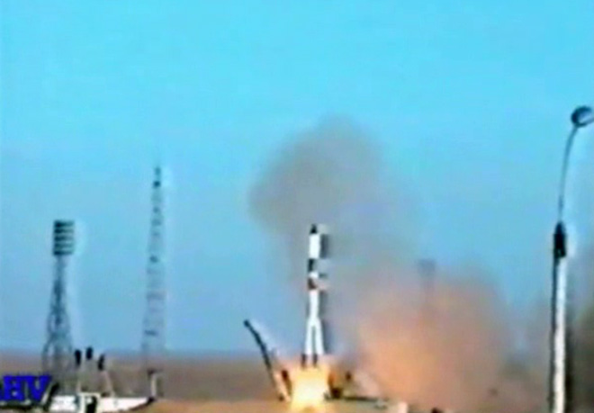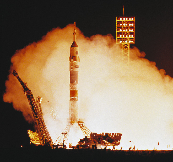 Fig. 1.1 : Décollage de Soyouz TM-20. La charge utile est constituée du vaisseau spatial Soyouz TM-20 (11F732A51 n°69), qui est placé avec succès sur une orbite basse (200,0km x 249,6km x 51,65°). Il a une masse de 7170kg, et son équipage est constitué du commandant Aleksandr VIKTORENKO, de l'ingénieur de bord Elena KONDAKOVA et du cosmonaute-expérimentateur Ulf MERBOLD, qui vole dans le cadre de la mission de visite EP-12 « EuroMir-94 ». Le vaisseau réalise un rendez-vous en trente-quatre orbites avec la station orbitale Mir, et accomplit plusieurs corrections d’orbite. La troisième correction est mise en œuvre sans l’aide du TsUP à cause d’une défaillance sur un système de transmission au sol. Le système électrique de Soyouz TM-20 bascule automatiquement sur ses batteries de secours pour une raison inconnue. Le PKhO du Module de Base de la station est occupé par le vaisseau Progress M-24, qui s’en sépare le 4 octobre 1994 à 18h55’52" GMT pour laisser la place à Soyouz TM-20.