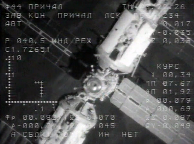 vice-Président GORE Le 10 février 1995, les moteurs de Progress M-25 sont mis en service à 18h35’42" GMT pour réaliser une correction de l’orbite de la station (dt=74", dV=2m/s, dh=6km, dm=62kg). La navette Discovery STS-63 atterrit sans incident au Centre Spatial Kennedy le 11 février 1995 à 11h50’19,054" GMT. Sa mission a duré 8 jours 6 heures 28 minutes 15 secondes. 7. Arrivée du vaisseau Progress M-26Le vaisseau de ravitaillement Progress M-26 décolle de Baïkonour le 15 février 1995. Le vaisseau Progress M-25 se sépare du module Kvant le 16 février 1995 à 13h02’30" GMT pour lui laisser la place. Progress M-26 s’amarre sans incident sur le module Kvant le 17 février 1995 à 18h21’33" GMT.