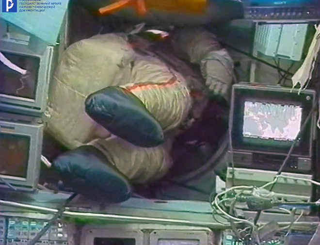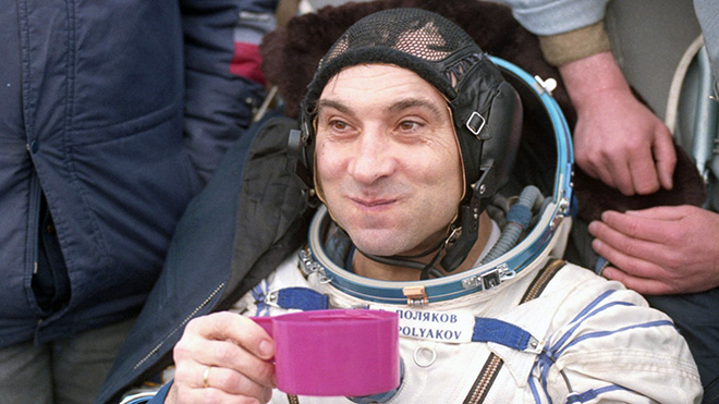 Fig. 9.1 : POLIAKOV après l'atterrissage de Soyouz TM-20. Le vol de VIKTORENKO et KONDAKOVA a duré 169 jours 5 heures 21 minutes 20 secondes, et celui de POLIAKOV a duré 437 jours 17 heures 58 minutes 17 secondes. Il s’agit encore aujourd’hui du plus long vol spatial jamais réalisé.