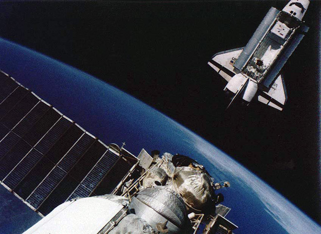 Fig. 6.2 : Discovery vue de Mir, avec le module Kristall en premier plan. A 15h25 GMT, la NASA annonce qu’elle considère la fuite sur le moteur R1U comme acceptable tant que les moteurs L1A, L3A et R3A sont opérationnels, et Discovery est donc autorisée à s’approcher de Mir. Si l’un de ces trois moteurs venait à dysfonctionner, ou si l’équipage de Mir détectait quelque chose s’anormal en observant le moteur, la navette se replierait immédiatement à 121m. La manœuvre d’approche finale commence à 16h37 GMT. A la distance de 610m, WETHERBEE prend le contrôle manuel et atteint les 121m à 18h21’07" GMT. Aucune alerte n’étant émise concernant le moteur R1U, il poursuit l’approche et atteint la distance minimale de 11,3m (mesurée sur la cible du PSO module Kristall) à 19h23’20" GMT. La navette commence à reprendre de la distance à 19h32 GMT. Quelques instants plus tard, le Président Bill CLINTON s’entretient avec l’équipage de Discovery.