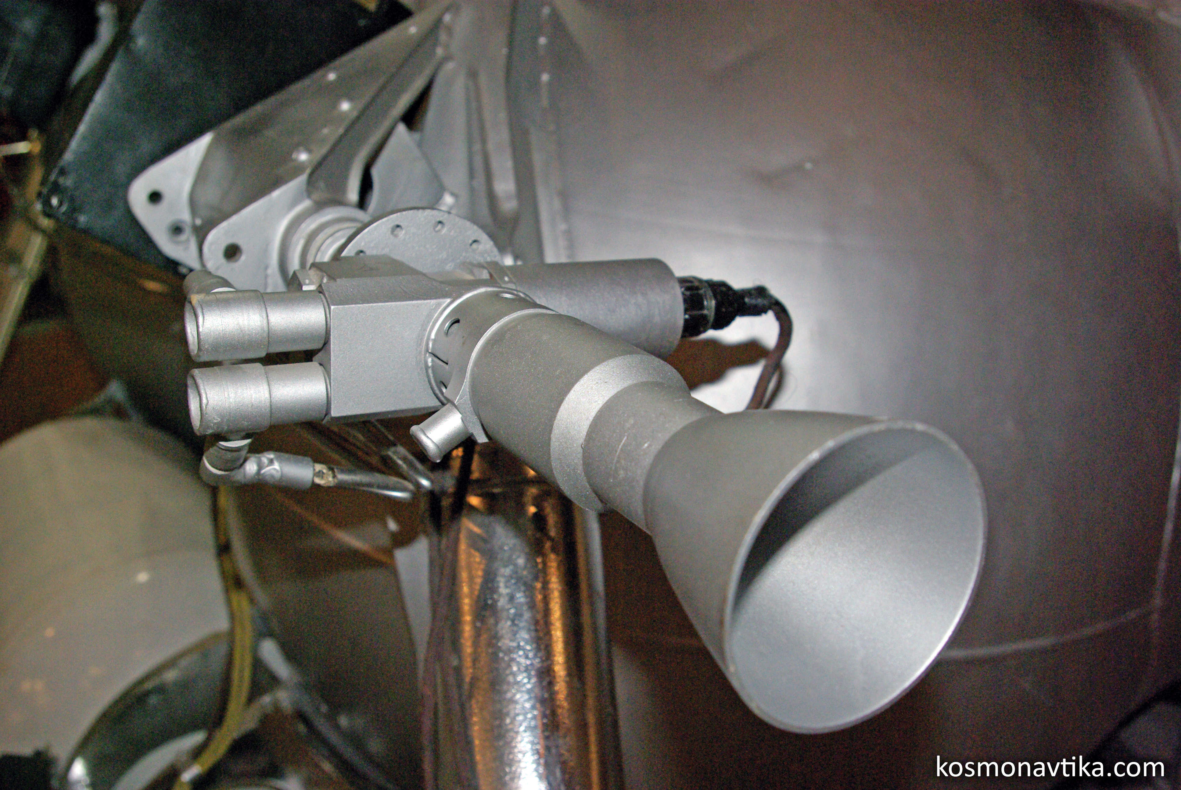 Fig. 1.1 : Le moteur R201-300 du missile Kh-22. Avec les premiers essais d'allumages de ces moteurs, l'OKB-300 a démontré son savoir-faire, et le décret du 23 juin 1960 (n°714-295) lui confie deux nouveaux projets, tous deux placés sous la maîtrise d'ouvrage de l'OKB-52 de Vladimir TCHELOMEÏ : les moteurs des satellites IS et US (qui existent en versions US-A et US-P) [3]. 2. Naissance de TMKB SoyouzL'ensemble moteur KD1-300 de l'IS vole pour la première fois à bord du satellite Poliot-2 le 12 avril 1964, mais il ne fonctionne pas correctement. L'OKB-52 exige, suite à cet incident, que la branche des moteurs-fusées devienne une entité indépendante de l'OKB-300. Le 1er août 1964, un ordre (n°280) du GKAT créée donc l'OKB-4-300 (boîte postale 1864) qui lui est directement rattaché, et qui ne dépend donc plus de l'OKB-300. Vladimir STEPANOV en devient le constructeur principal [1][5].