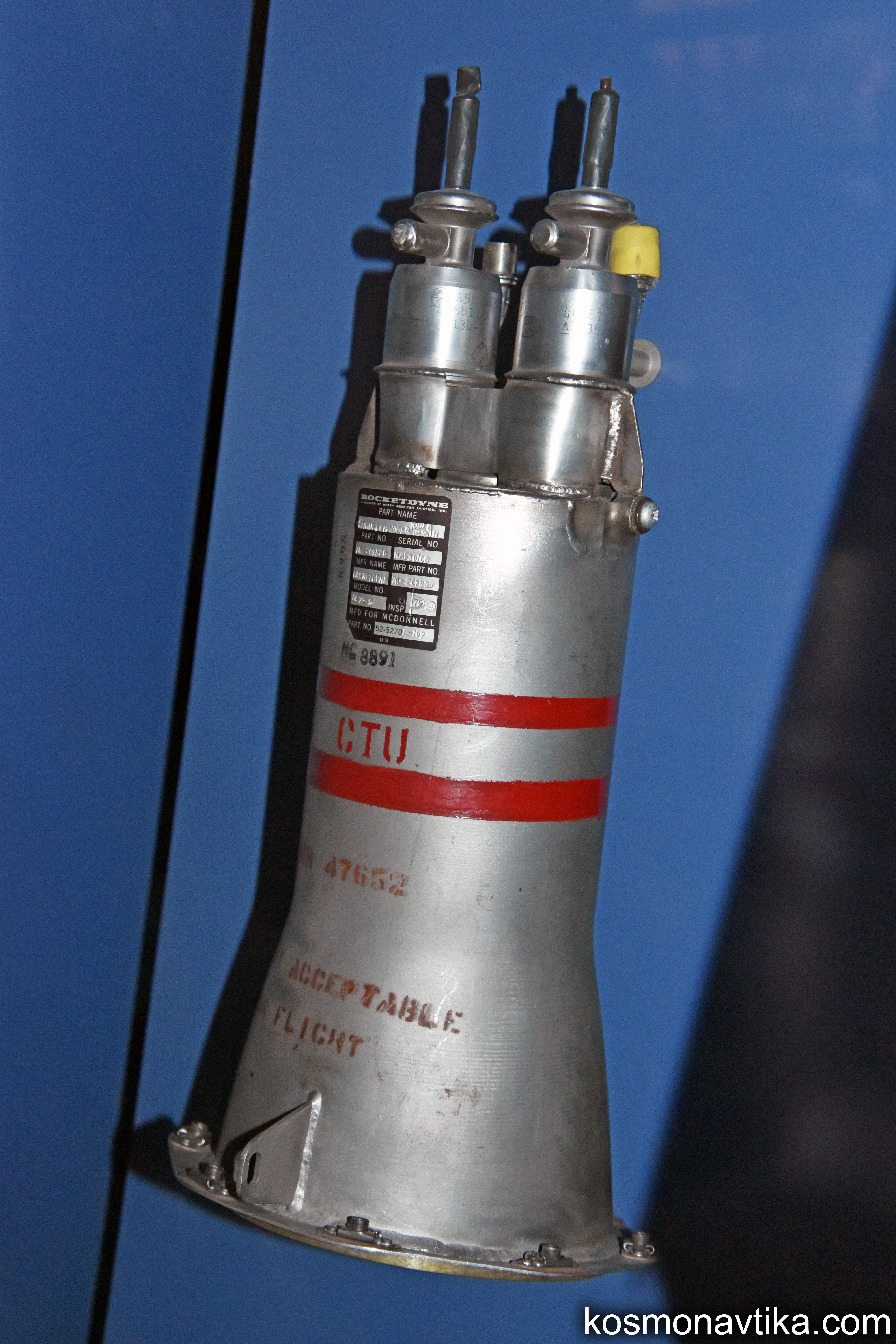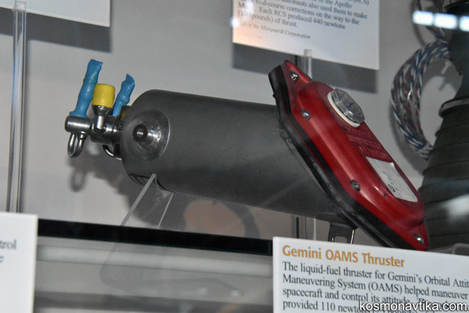 Gemini | Divers1. Moteurs OAMSUn moteur de type SE7-5 faisant partie du système OAMS des vaisseaux Gemini est exposé au Musée de l'Air et de l'Espace du Bourget. Un autre exemplaire de moteur de l'OAMS est exposé au Centre Steven F. Udvar-Hazy de Chantilly, en Virginie, aux Etats-Unis. 2. Moteurs RCSUn moteur RCS des vaisseaux Gemini est exposé au Musée de l'Air et de l'Espace du Bourget. 3. Bouclier thermiqueDeux boucliers thermiques, l'un utilisé et l'autre non, de Gemini sont exposés au Centre Steven F. Udvar-Hazy de Chantilly, en Virginie, aux Etats-Unis. Le musée ignore si le bouclier utilisé a volé sur une Gemini ou s'il n'a servi que pour des essais au sol. 4. Projet MOLUne maquette représentant un vaisseaux Gemini en configuration MOL (Manned Orbital Laboratory) est exposée au Hermann-Oberth-Raumfahrt-Museum de Feucht, en Allemagne.