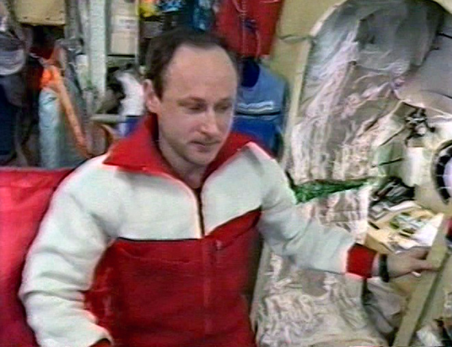 Fig. 7.1 : ARTSEBARSKI à bord du Module de Base. 8. La cinquième sortie dans l'EspaceLa cinquième sortie dans l'Espace de la mission EO-9 débute le 23 juillet 1991 à 09h15 GMT quand les cosmonautes Anatoli ARTSEBARSKI (Orlan-DMA n°6) et Sergueï KRIKALIOV (Orlan-DMA n°8) ouvrent l'écoutille du ChSO du module Kvant-2. L'activité de la sortie consiste à poursuivre le montage de la poutre Sofora sur le module Kvant. Les cosmonautes assemblent onze sections supplémentaires ainsi que le support rotatif, puis ils rentrent dans le sas et referment l'écoutille à 14h57 GMT. La sortie a duré 5h42. 9. La sixième sortie dans l'EspaceLa sixième sortie dans l'Espace de la mission EO-9 débute le 27 juillet 1991 à 08h44 GMT quand les cosmonautes Anatoli ARTSEBARSKI (Orlan-DMA n°6) et Sergueï KRIKALIOV (Orlan-DMA n°8) ouvrent l'écoutille du ChSO du module Kvant-2. L'objectif de la sortie est de terminer le montage de la poutre Sofora sur le module Kvant. Les cosmonautes assemblent les six dernières sections, puis ils inclinent la poutre de 11°. ARTSEBARSKI installe un drapeau soviétique au sommet de la poutre, puis les deux cosmonautes retournent vers le module Kvant-2. Là, ils larguent le scaphandre Orlan-DMA n°10 qui n'est plus fonctionnel. Ils rentrent dans le sas et ferment l'écoutille à 15h33 GMT. La sortie a duré 6h49.