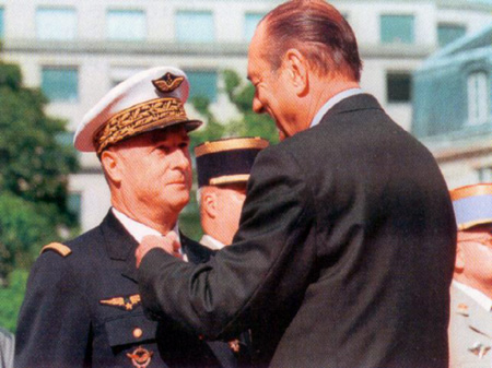 Officier de la Légion d'Honneur par le Président Jacques CHIRAC. Jean-Pierre JOB retourne donc à ses affaires dans l'Armée de l'Air. Après quelques affectations, il prend en avril 1987 le commandement de la Base aérienne 115 d'Orange. Il participe aux opérations au Tchad (Épervier) et en Irak (opération Daguet). En décembre 1990 il devient Général de brigade aérienne. Le 1er août 1992, il est nommé chef du Bureau Espace à l'État-major des Armées. Du 2 juillet 2000 au 30 juin 2002, il occupe le poste de Chef d'état-major de l'Armée de l'Air. Le 1er septembre 2002, il est placé "en congé du personnel navigant", à cause des règlementations quant à la limite d'âge. A compter du 1er février 2004, il est admis sur sa demande dans la 2ème section du cadre des officiers généraux de l'armée de l'air. Le Général JOB est Commandeur de la Légion d'honneur, Commandeur de l'Ordre national du mérite, Titulaire de la Croix de la valeur militaire, de la Médaille de l'Aéronautique et de la Médaille Outre-mer, avec agrafe Tchad et Moyen-Orient. Dernière mise à jour : 11 février 2007 |