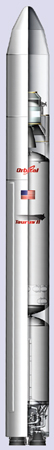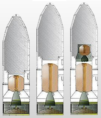 Fig. 2 : De gauche à droite : les parties hautes Un deuxième étage amélioré, CASTOR 30XL, est en cours de développement. Il sera propulsé par un moteur à ergols liquides, et il permettra d'emporter le vaisseau spatial Cygnus vers la Station Spatiale Internationale. Le troisième étagePour des missions vers l'orbite de transfert géostationnaire (GTO), un troisième étage est nécessaire. Orbital a décidé d'utiliser le moteur STAR 48V d'ATK, qui a déjà volé à de nombreuses reprises, notamment sur la navette spatiale et sur le lanceur Delta II de Boeing. Un autre petit troisième étage appelé BTS est envisagé. Il est basé sur le système de propulsion de la plate-forme de satellites STAR 2.