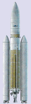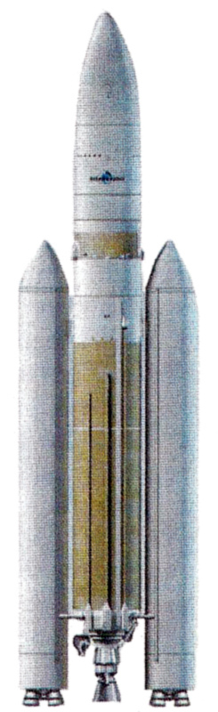 Fig. 3.1 : Schéma d'une Ariane 5 ECA équipée de deux étages de Youzhnoïe. Ces étages seraient dérivés du premier étage du lanceur Zenit, qui était déjà utilisé comme étage d'accélération pour le lanceur super-lourd Energiya, dans les années 1970-1980. Youzhnoïe propose soit de conserver le moteur RD-171M de la NPO Energomach, qui est en service actuellement, soit d'utiliser le nouveau RD-810 qu'il développe lui-même, et qui fonctionne également à l'oxygène liquide et au kérosène. Ce nouveau moteur est un monochambre kérosène-oxygène liquide capable de développer une poussée dans le vide de 215tf, et il en faudrait donc quatre pour égaler le RD-171M. On rappelle que le Moteur à Propergol Solide (MPS) de la Snecma, qui équipe actuellement les EAP, a une poussée de 6700kN. Par ailleurs, le RD-810 a une impulsion spécifique de 335", sensiblement équivalente à celle du RD-171M (337"), mais supérieure à celle du MPS (273"). Un cardan permet d'orienter la poussée dans deux plans différents. Équipée de ces accélérateurs, Ariane 5 ECA aurait une masse au lancement de 940t (contre 777t avec les EAP) et pourrait placer 14t en orbite de transfert géostationnaire (contre 9,5t). Il est toutefois extrêmement peu vraisemblable qu'une suite soit donnée à ce projet, tant il nuirait à l'industrie spatiale européenne.