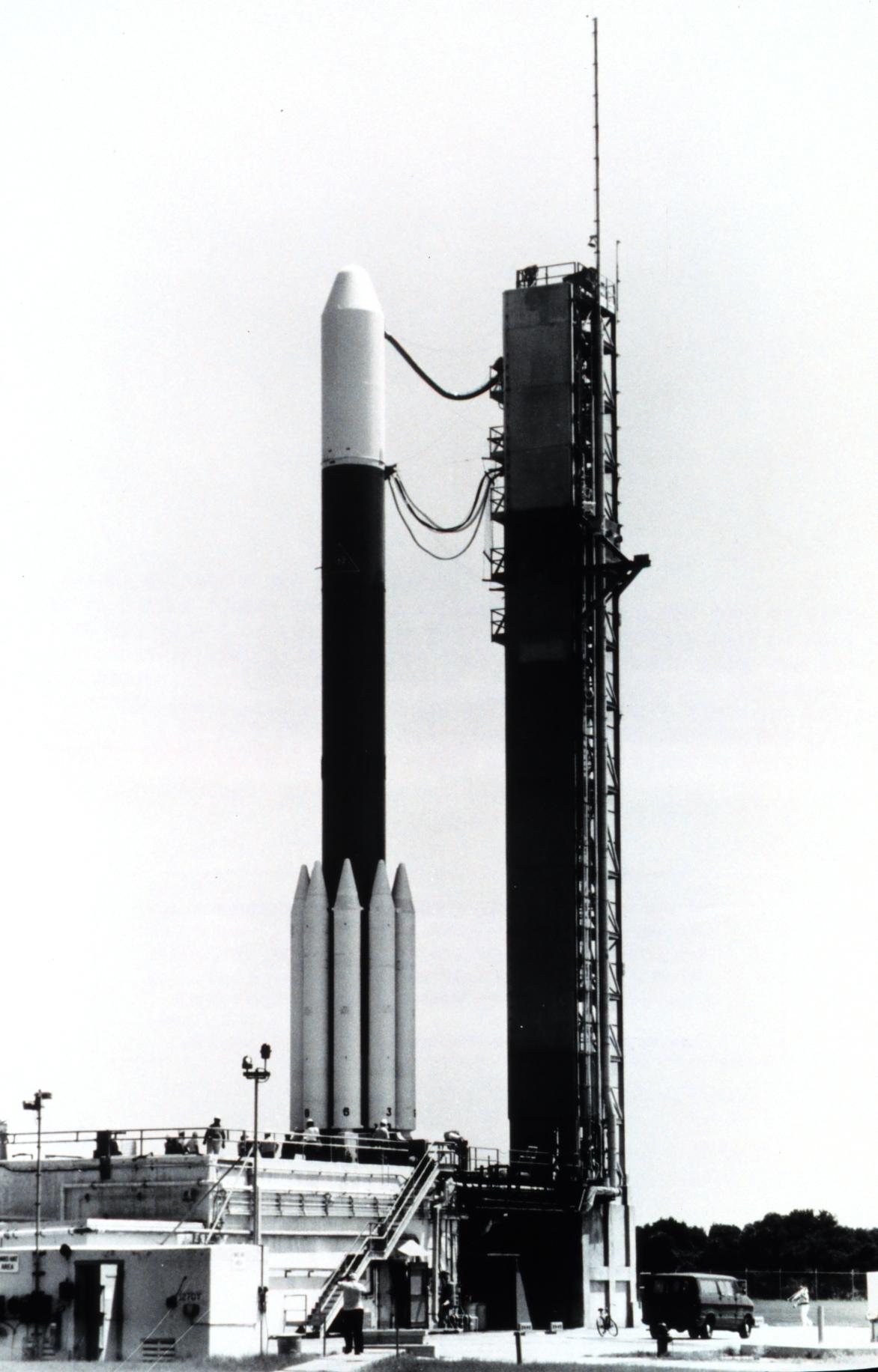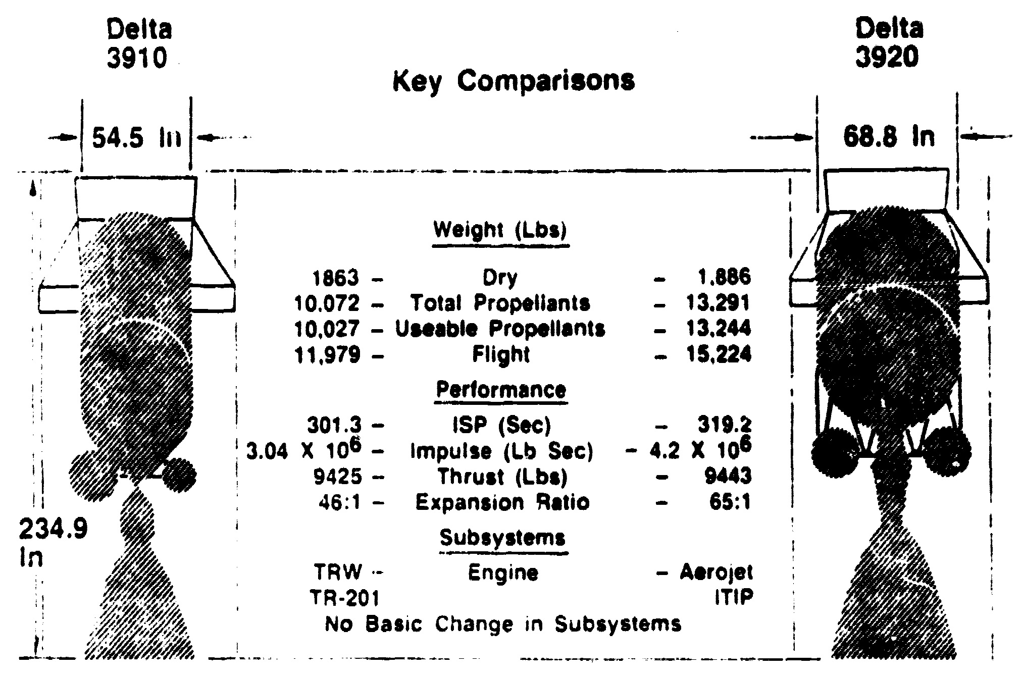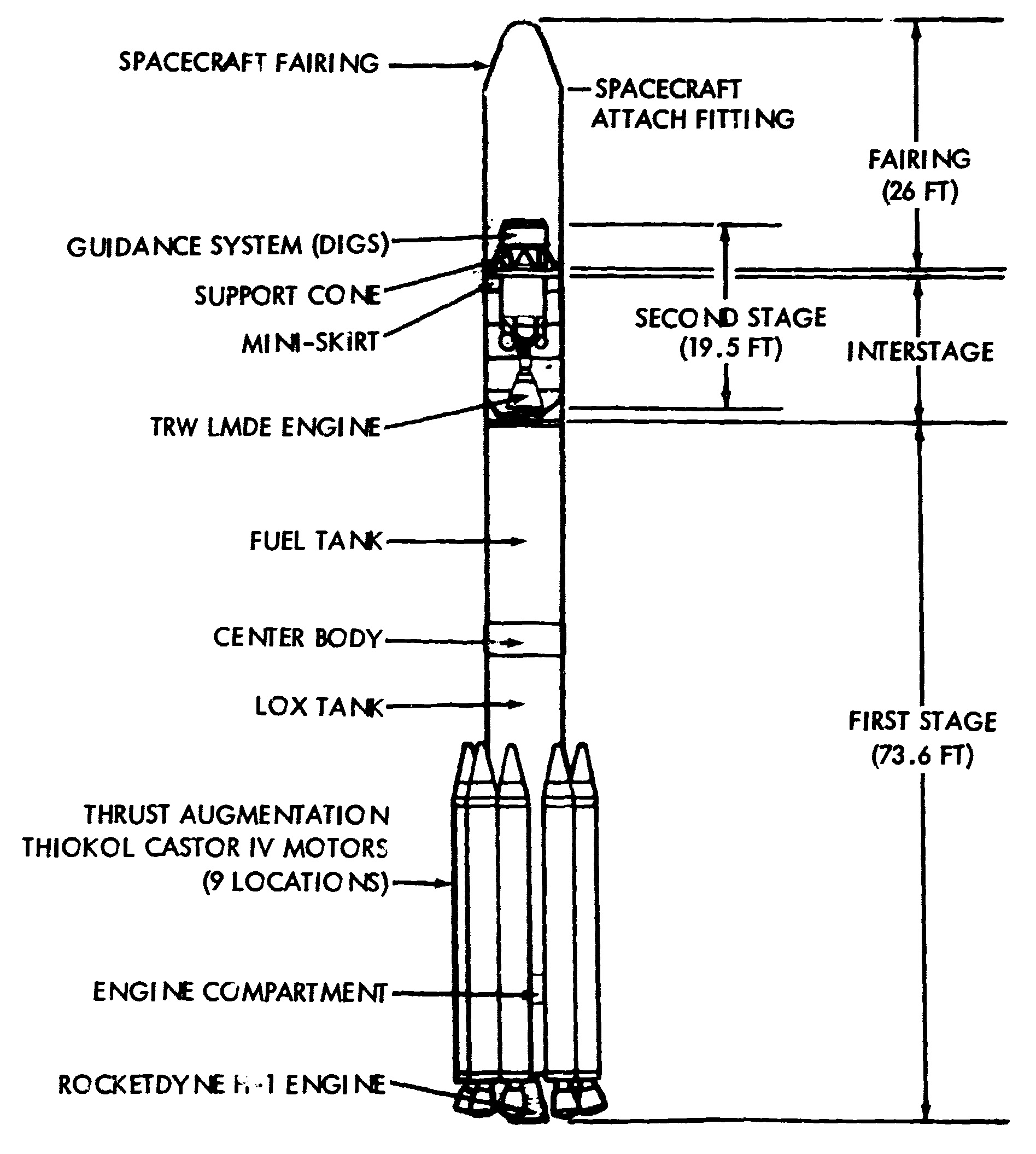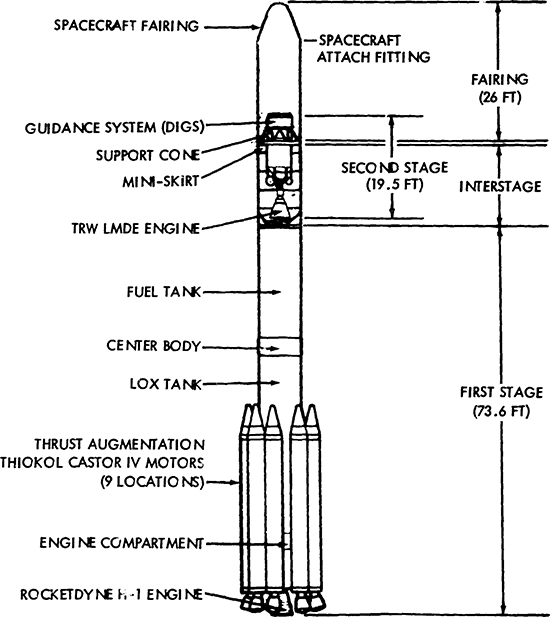 Toutes les versions utilisent : - un premier étage allongé étendu ELTT (Extended Long Tank Thor), de type DSV-3P-1A, avec un diamètre de 2,433m et une hauteur de 21,3m. Il est doté du moteur RS-27 de Rocketdyne orientable selon les axes de tangage et de lacet, et dérivé du moteur H-1 du lanceur Saturn IB. Il fonctionne au kérosène RP-1 et l'oxygène liquide, et fournit une poussée de 911,840kN avec une Isp de 262,4" pendant 228". Le pilotage en roulis est assuré par deux moteurs verniers LR101-NA-11 [1]. - neuf étages d'accélération à ergols solides Castor 4 (TX-526) de Thiokol. Avec une hauteur de 11,3m et un diamètre de 101,6cm, ils fournissent chacun une poussée de 407kN avec une Isp de 230" pendant 58". L'ergol est du perchlorate d'ammonium (TP-H-8038) avec du PBAA comme liant. Cinq Castor 4 sont allumés au moment du décollage, et les quatre autres le sont à H0+64" [1]. Le deuxième étage, en fonction de la version, peut-être : - un Delta-P, ou DSV-3P-5, de 7,0m de long et de 1,397m de diamètre doté du moteur rallumable TR-201 de TRW. Il est alimenté par pressurisation des réservoirs et il est dérivé du moteur de descente du LM d'Apollo. Il fonctionne au peroxyde d'azote et à l'aerozine-50 et fournit une poussée de 43,398kN avec une Isp de 302" pendant 315". - un ITIP (Improved Transtage Injector Program), motorisé par un AJ10-118K rallumable et alimenté par pressurisation, et développant une poussée dans le vide de 41,969kN avec une Isp de 319". Il a une hauteur de 7,0m et un diamètre de 175,3cm. Il fonctionne pendant une durée maximale de 445", et ses ergols sont le peroxyde d'azote et l'aerozine-50 [3]. Les versions Delta 3914 et Delta 3924 utilisent un étage supérieur Star 37E (TE-M-364-4), avec une poussée de 66,656kN, une Isp de 285,5" et une durée de fonctionnement est de 43,6". L'ergol utilisé est le TR-H-3062 [1]. La version Delta 3913, quant à elle, utilise un Star 37D. Les versions Delta 3910 et Delta 3920 peuvent voler sans étage supérieur ou avec un PAM-D, qui est muni d'un moteur Star 48 avec une poussée de 66,7kN, une Isp de 287" et un temps de fonctionnement de 85,3". Les lancements ont eu lieu depuis le pas de tir LC 2W de la base de Vandenberg, ainsi que depuis les pas de tir LC 17A et LC 17B de la base de Cap Canaveral. Bibliographie[1] Dossier de presse du lancement Anik B Dernière mise à jour : 2 février 2026 |
