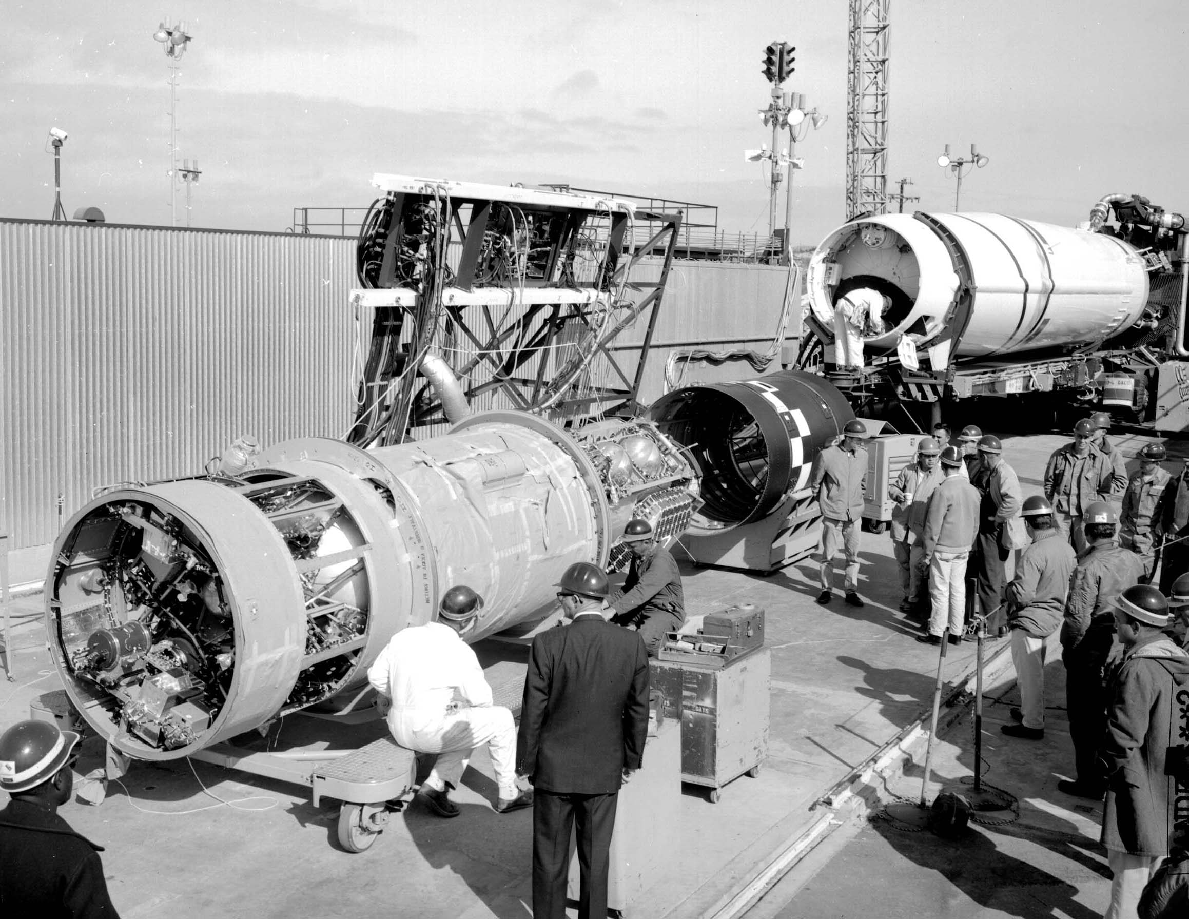 Fig. 1 : Mise en place de l'étage Agena D sur le Thor SLV-2A. Très similaire au Thor DM-21, il est doté du moteur MB3-III (LR79-NA-13) de Rocketdyne, qui fonctionne au kérosène RP-1 et à l'oxygène liquide et fournit une poussée de 765,3kN avec une Isp de 252,4" pendant 265". Le pilotage est assuré par deux moteurs verniers LR101-NA-11. Pour la première fois dans l'histoire de la famille des Thor, il est équipé d'étages d'accélération à ergols solides. Il s'agit d'étages Castor 1 (XM-33-52) de Thiokol, qui sont au nombre de trois. L'ergol utilisé est le perchlorate d'ammonium. Les trois étages combinés fournissent une poussée totale de 73,6kgf pendant 39", et ils sont largués à H0+65". L'objectif est surtout de tester cette configuration dans le cadre du développement de la version Thorad du lanceur.