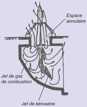 Centre Spatial Guyanais. Le système d'éjectionAprès leur allumage, les moteurs des deux premiers étages, les RD-107 et RD-108, ne délivrent pas immédiatement leur puissance nominale. Ils passent par un stade préliminaire où la pression dans les chambres de combustion ne dépasse pas 10 bars. Le débit de kérosène, en revanche, est proche de sa valeur nominale. En conséquence, une grande partie de sa masse ne s'enflamme pas et va s'éteindre dans le fond du carneau. Une partie du kérosène arrive toutefois à brûler, mais les gaz chauds qui en résultent, du fait de la faible pression dans la chambre, ne sont pas éjectés vers le bas. A l'inverse, ils ont tendance à remonter, ce qui fait encourir un risque très important au lanceur, qui se retrouve baigné dans une masse de gaz chauds. Vidéo