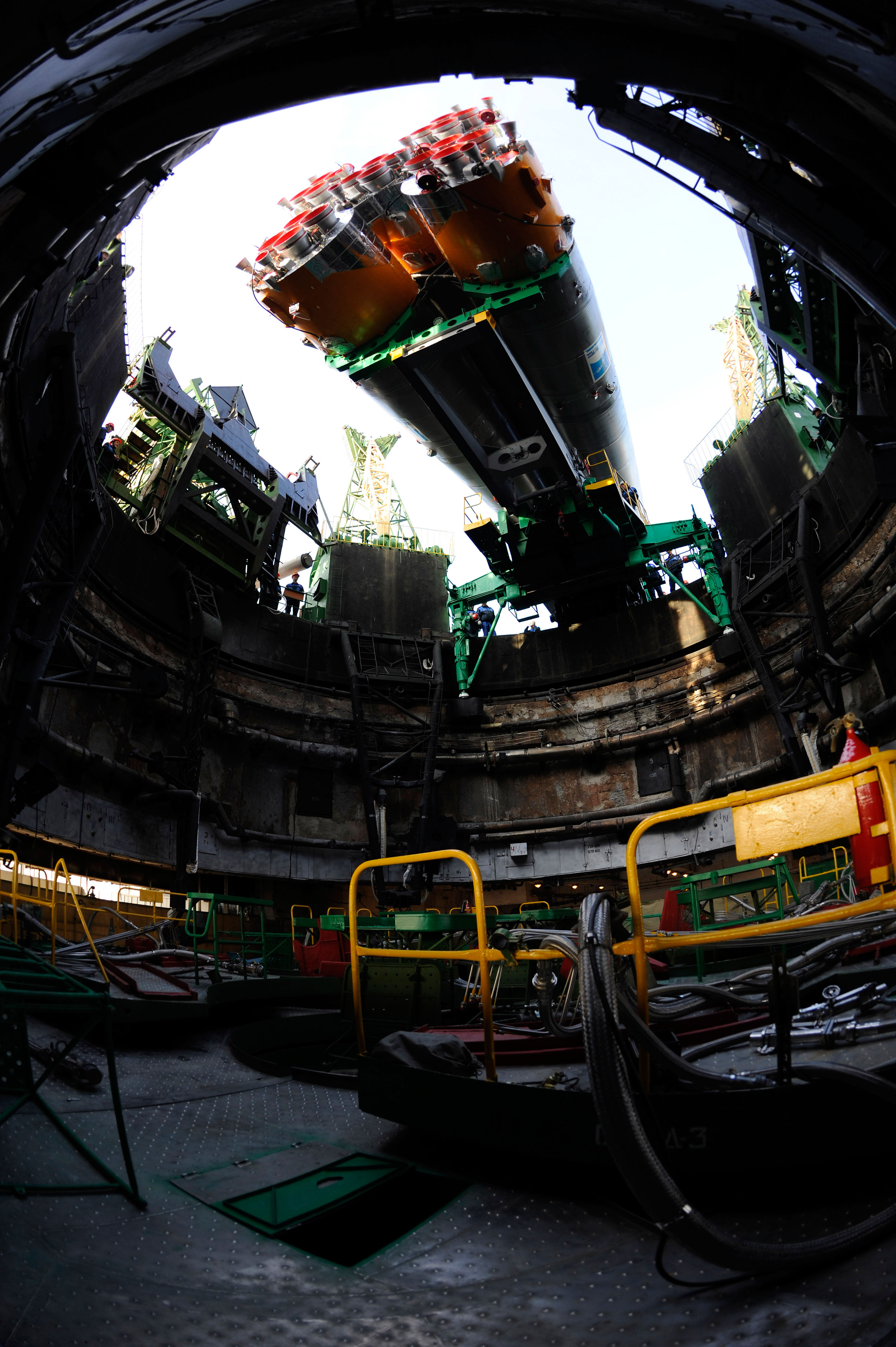 Soyouz | Le carneauIl existe plusieurs façons de gérer l'immense quantité de gaz de combustion qui s'échappe d'une fusée lors de son décollage. Pour la R-7 et ses multiples dérivés, c'est l'option du carneau qui a été retenue. GénéralitésUn carneau est un grand fossé, muni d'un déflecteur de gaz, au-dessus duquel le lanceur est suspendu avant son décollage. Quand les moteurs sont allumés, les gaz disposent de suffisamment d'espace pour pouvoir s'échapper sans entourer le lanceur, ce qui évite d'atteindre un niveau de vibrations trop important. A Baïkonour, le carneau du premier pas de tir (17P32-5) a une profondeur de 42m. Toutefois, ce premier pas de tir avait été surdimensionné, et le carneau du second pas de tir (17P32-6) ne fait que 20m de profondeur. Celui du Centre Spatial Guyanais fait 26m de profondeur. De plus, les carneaux des quatre pas de tir de Plesetsk sont beaucoup moins étendus que leurs homologues guyanais et kazakhs.