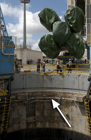 2011. Un système d'éjection a donc été mis en place. Un collecteur muni de sprinklers est fixé tout autour du pas de tir, et encercle complètement la base du lanceur. Il est gonflé avec de l'air sous pression, et après l'allumage des moteurs les sprinklers, dirigés vers le bas, refoulent l'air qui repousse les gaz de combustion dans le fond du carneau. Le collecteur commence à être gonflé à l'instant H0-30'. Les sprinklers, quant à eux, sont ouverts à H0-15", juste avant l'allumage des moteurs qui intervient à H0-10,8".