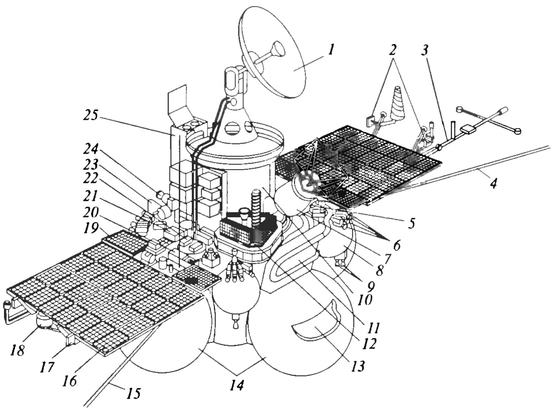 Fobos | La plate-forme1. GénéralitésLes sondes 1F sont constituées du Bloc Orbital OB (Орбитальный Блок) et de l'Ensemble Moteur Autonome ADU (Автономная Двигательная Установка). La masse totale est de 6220kg, dont 3575kg d'ergols et 540kg de charge utile scientifique.