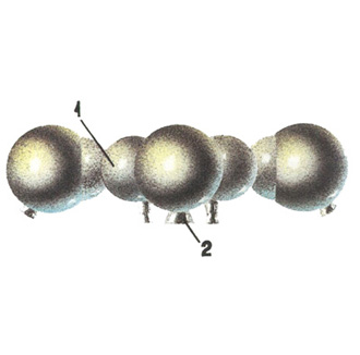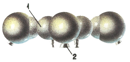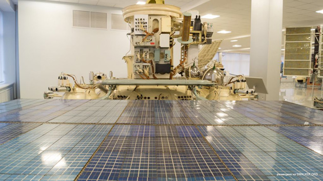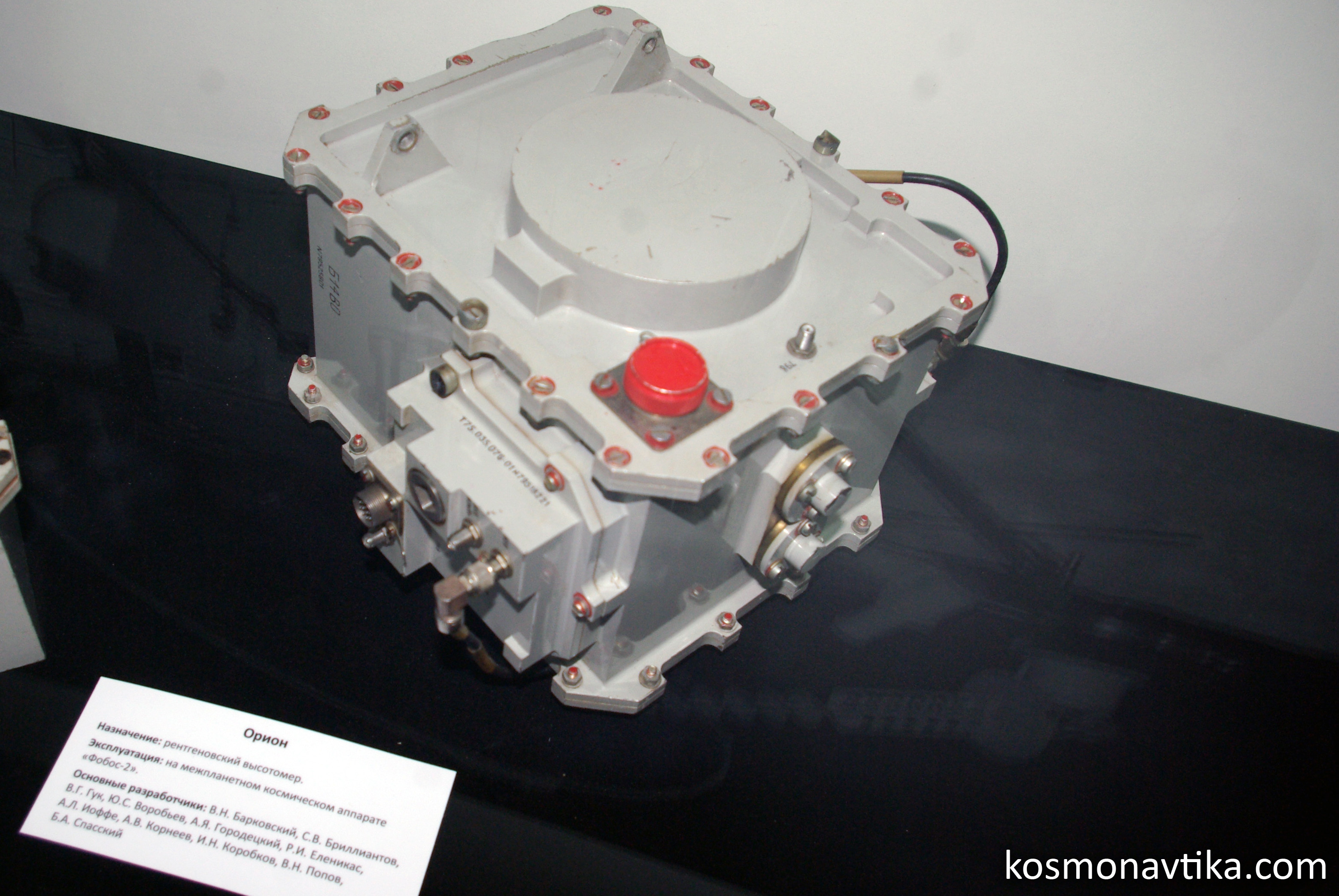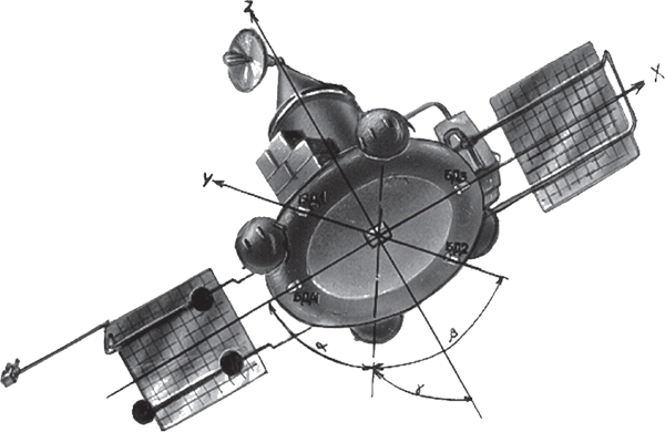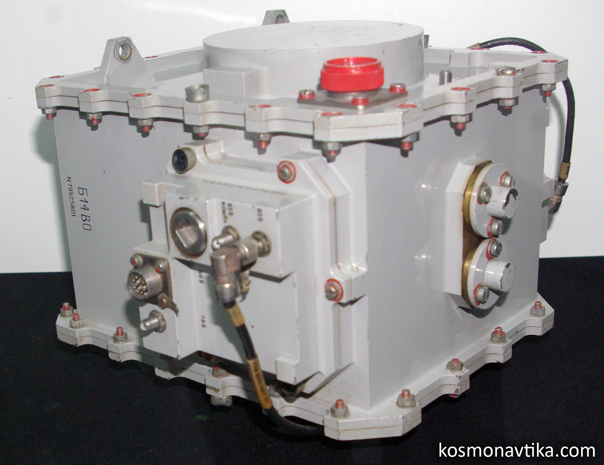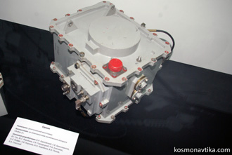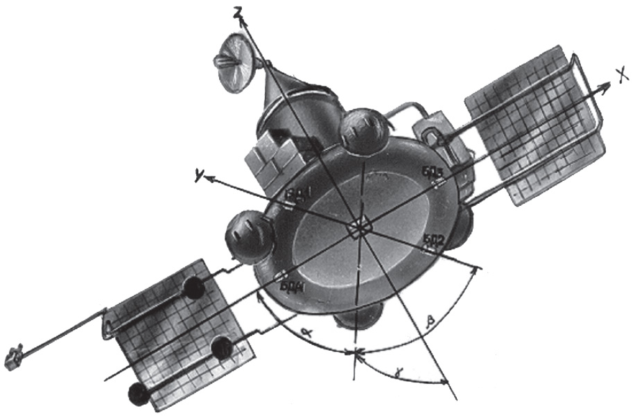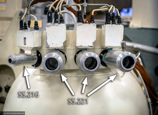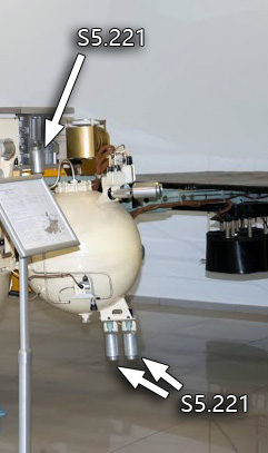 Fig. 3.2.3 : Vue des moteurs orientés selon l'axe vertical. L'orientation de la sonde peut également être contrôlée par un ensemble de vingt-quatre moteurs à gaz GD (Газовый Двигатель), qui fonctionnent à l'hydrazine passé à l'état gazeux à l'aide d'un générateur de gaz. Certains GD sont disposés à l'extrémité des panneaux solaires, d'autres sur les barres de soutien des réservoirs d'hydrazine [3]. Les GD sont fournis par le KTsKBA de Kiev. Leurs électrovannes d'alimentation sont qualifiées pour 106 cycles à des pression allant jusqu'à 0,5MPa et dans une gamme de températures comprises entre -60°C et 80°C [8]. 3.3. Le système de contrôleLes sondes 1F sont commandés par leur Complexe de Contrôle Embarqué BUK (Бортовой Управляющий Комплекс), fourni par la filiale de Fili de la NPO AP. Le BUK est conçu autour de l'ordinateur de bord LG499 à trois voies redondantes, développé sur la base de l'ordinateur M4M par la NPO Elektropribor [3], et produit par le PO Monolit de Kharkov [4]. Le M4M a déjà volé à de nombreuses reprises sur plusieurs missiles balistiques.