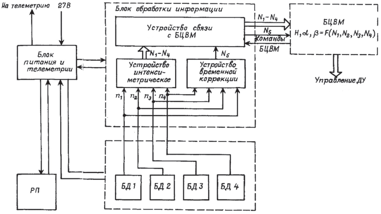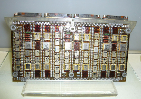 Fig. 3.3.1 : L'ordinateur M4M, qui sert de base au LG499. Les données de vitesse et de position sont fournies par la centrale inertielle LV300, qui utilise des gyroscopes KI79-119, et par le système optique 8KS. Celui-ci est constitué des capteurs optiques 279K, 280K (stellaire) et 281K (solaire), fournis par le TsNII Gueofizika [3].