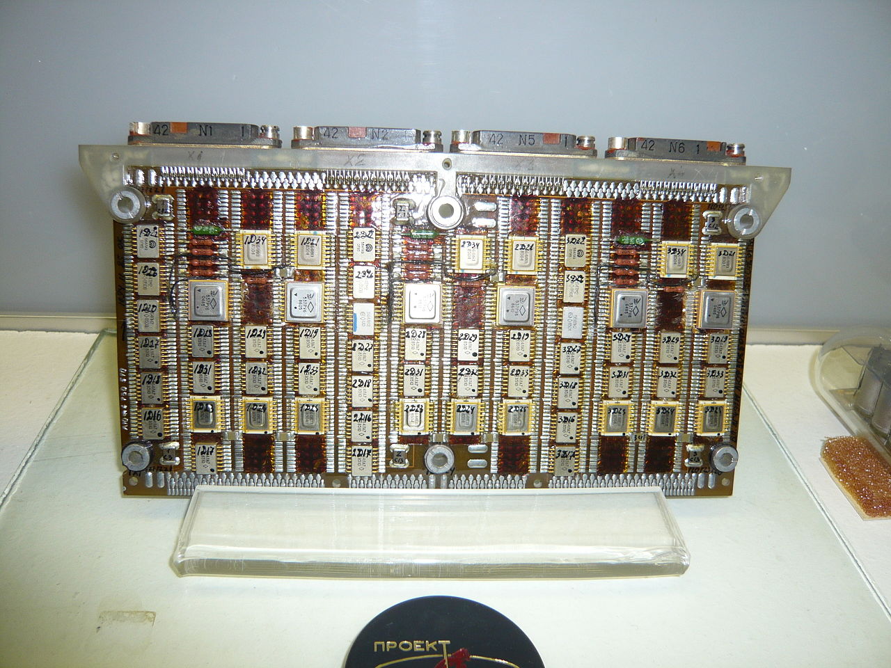Fig. 3.3.2 : L'une des cartes électroniques du système de contrôle des sondes Fobos. 3.4. Le système de télécommunicationsLe Complexe Radio Principal MRK (Магистральный Радиокомплекс), fourni par le RNII KP, est constitué de quatre systèmes [3] : 3.4.1. Le système radio (MRS) Il permet à la sonde de communiquer dans les deux sens avec la Terre. Il est constitué [3] : - de deux récepteurs de commandes ChA237 (772MHz) redondants, reliés aux antennes omnidirectionnelles - du récepteur ChA236, utilisé pour les mesures de trajectoires. Il peut fonctionner en mode centimétrique (5,01GHz), relié à n'importe quelle antenne, ou en mode décimétrique, relié à l'antenne omnidirectionnelle. - de deux émetteurs ChA235M (5,88GHz), qui peuvent être reliés à l'antenne directionnelle quand la sonde est en mode d'orientation trois axes, ou aux antennes omnidirectionnelles quand la sonde est en mode d'orientation sur un seul axe. - de l'émetteur ChA231 (926MHz), relié aux antennes omnidirectionnelles, utilisé pour les communications proches de la Terre. Cet émetteur peut être connecté à l'antenne semi-directionnelle pour conduire des expériences de diffusion des ondes radio. L'antenne directionnelle, placée au sommet de la sonde, offre un gain G≥600 dans un cône de 2°, et un gain G≥300 dans un cône de 3°. L'antenne semi-directionnelle offre un gain G≥10 dans un cône de 9,5° [3].