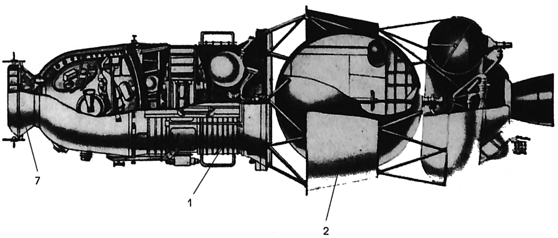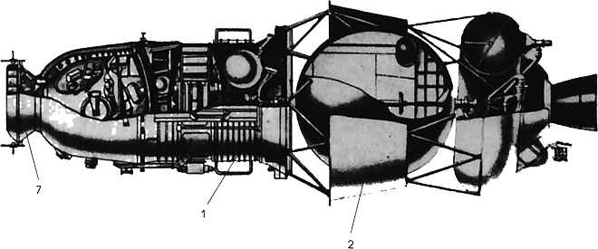 Fig. 7.1 : Intérieur du SA de Zond-7. Le SA du 7K-L1 dispose de huit moteurs pour assurer l'orientation lors de la phase de rentrée dans l'atmosphère. Il s'agit de micromoteurs de 1 à 1,5kgf de poussée fonctionnant au peroxyde d'hydrogène, identiques à ceux du vaisseau Soyouz. Ceux qui contrôlent le roulis ont toutefois été doublés afin d'augmenter la fiabilité [7]. Cette modification sera d'ailleurs reprise sur le vaisseau Soyouz de seconde génération, Soyouz T.