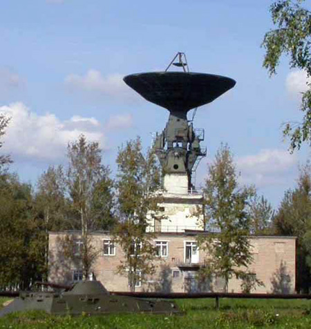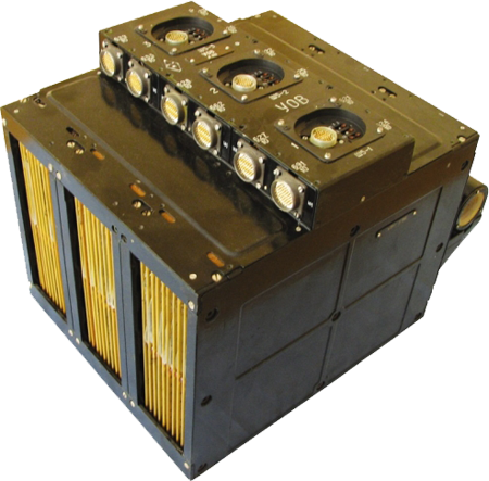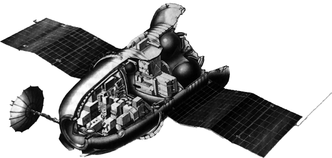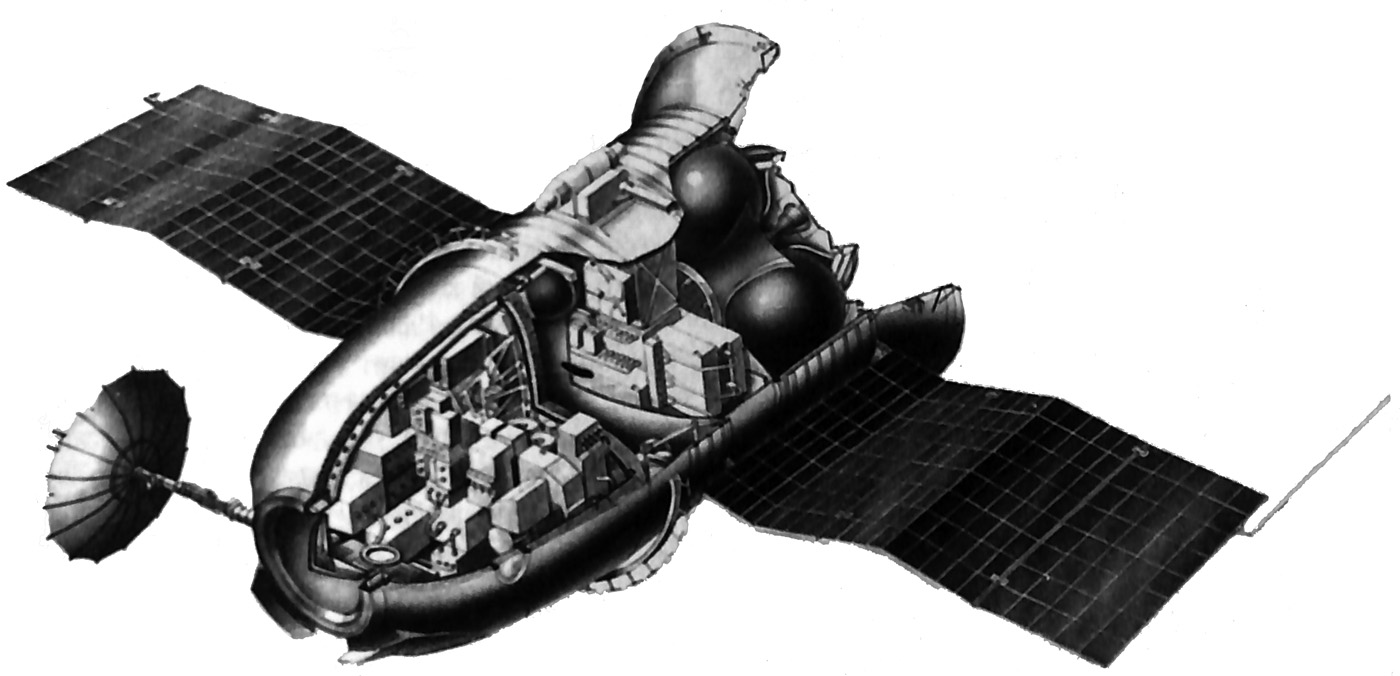 Fig. 4.1 : Schéma de la tour d'éjection 11D836. La tour 11D836 a une hauteur de 5940mm, un diamètre de 1400mm et une masse de 2070kg. Elle abrite deux moteurs à ergols solides. Le moteur principal TsRD (Центральный ракетный двигатель) est destiné à éjecter le vaisseau en cas d'échec. Il a une masse de 1750kg et fournit une poussée comprise entre 490kN et 899kN, pour une impulsion totale de 1666kN.s [3]. Le moteur RDR (Ракетные двигатели разделения) permet d'éloigner la coiffe du SA après que celui-ci a été extrait du lanceur et amené à une distance de sécurité. Lors d'un lancement nominal, il permet d'éjecter la tour d'éjection. Il fournit une poussée comprise entre 83,9kN et 156,8kN, pour une impulsion totale de 129,48kN.s. Sa masse est de 312kg [3]. Par ailleurs, quatre moteurs de contrôle URD (Управляющие ракетные двигатели), dirigés latéralement, permettent de déporter la trajectoire du vaisseau pendant le fonctionnement du moteur TsRD. 5. TélécommunicationsLes vaisseaux 7K-L1 communiquent avec la Terre à l'aide du complexe DRK (Дальний Радиокомплекс), qui regroupe le système embarqué DRS et l'ensemble de stations sol Saturn-MS [4]. Le DRK a été testé en conditions réelles sur deux sondes E-6LS : Cosmos 159 et Luna-14. 5.1. Le système DRSIl est constitué d'un émetteur, du système de télémétrie BR-9-7 [6] fourni par le RNII KP, d'une antenne parabolique directionnelle (ONA) et d'une antenne omnidirectionnelle [25]. Les transmissions de et vers la Terre sont assurées au moyen d'une antenne parabolique déployée après le lancement, et larguée avant la rentrée dans l'atmosphère. 5.2. Les stations Saturn-MSQuatre stations Saturn-MS sont construites dans le cadre du programme 7K-L1 : la première au NIP-3 de Sary-Chagan au Kazakhstan, la deuxième au NIP-14 de Chtchiolkovo près de Moscou, la troisième au NIP-15 d'Oussouriïsk dans le kraï du Primorié et la quatrième au NIP-16 d'Eupatorie en Crimée [4]. Elles permettent de capter la télémétrie des vaisseaux, de mesurer leur trajectoire, d'envoyer des commandes, de recevoir des images TV et d'assurer les communications audio avec l'équipage. Elles fonctionnent en UHF : 770MHz en liaison montante, et 920MHz en liaison descendante [5]. Toutes les stations Saturn-MS utilisent des antennes paraboliques RS-10-2M, qui permettent à la fois d'émettre et de recevoir, à l'exception de la station du NIP-16 qui utilise une antenne KTNA-200 pour l'émission et une antenne P-200 pour la réception. Les antennes RS-10-2M ont un diamètre de 16m et émettent des signaux avec une puissance de 20kW. Les signaux sont émis en multiplexage fréquentiel [5]. Plusieurs vaisseaux 7K-L1 étaient également équipés d'un système expérimental de transmission d'images dont les signaux étaient reçus par l'antenne de 32m de diamètre d'Eupatorie [5]. 5.3. Navires de communicationsPlusieurs navires ont été affectés au programme 7K-L1 dans le cadre du projet Selena. Il s'agit du Nevel, du Morzhoviets, du Kegostrov, du Borovitchi, du Kosmonavt Vladimir Komarov, du Bezhitsa, du Dolinsk, du Ristna et de l'Aksaï. 6. Système de contrôleComme on l'a vu au paragraphe 2, la vitesse à laquelle le 7K-L1 amorce sa rentrée dans l'atmosphère lui impose de faire un rebond qui le déporte d'environ 10.000km. L'orientation du vaisseau ne peut donc pas être contrôlée par un système classique qui ne prend en compte que deux paramètres : l'angle d'attaque et la poussée des moteurs. L'OKB-1 a donc décidé de l'équiper d'un système de contrôle innovant basé sur l'utilisation d'un ordinateur embarqué, ce qui constitue une première en Union soviétique. Le système est développé sous la maîtrise d'œuvre du NPTs AP de Nikolaï PILIOUGUINE. Il est constitué d'un certain nombre de capteurs qui envoient leurs données à un ordinateur, et ce dernier en déduit l'orientation à donner au vaisseau. 6.1. L'ordinateur de bordL'ordinateur de bord du 7K-L1 est un Argon-11S développé par le NIEM de Sergueï KROUTOVSKIKH sous la direction de G.M. PROKOUDAÏEV et N.N. SOLOVIOV. Il a une masse de 34kg et ses dimensions sont 305x305x550mm. Il peut fonctionner pendant 2h40 sans interruption sous des températures de 0 à 40°C et des pressions de 400 à 1000mmHg. Il peut subir des accélérations allant jusqu'à 10G et consomme 75W [11]. L'Argon-11S est constitué de trois calculateurs redondants. Sa mémoire vive a une capacité de 128 mots de 14 bits, et sa mémoire morte a une capacité de 4096 mots de 17 bits. Il a un temps de calcul de 30μs pour les additions, et de 160μs pour les multiplications [11]. Il utilise le circuit intégré Tropa-1 du NIITT (aujourd'hui Angstrem) de Zelenograd. Il s'agit de l'un des premiers circuits intégrés fabriqués par l'Union soviétique [12]. Avec ces circuits, l'Argon-11S est capable de réaliser 200.000 opérations par seconde. 6.2. Les capteursLe 7K-L1 est équipé d'une centrale inertielle trois axes L300 fournie par le NPTs AP. Elle est constituée d'un gyroscope KI99-20A et de deux accéléromètres, appelés TsE199-2 et 142ZhS. Deux accéléromètres supplémentaires, appelés K199-1Zh et L304, servent au contrôle manuel [13]. L'orientation dans l'Espace est réalisée en se basant sur les informations du capteur stellaire 100K, du capteur d'horizon terrestre 101K et du capteur solaire 99K, tous fournis par le TsKB Gueofizika [1]. 7. Rentrée dans l'atmosphère et atterrissageLa descente dans l'atmosphère se fait grâce à un système de parachutes en série. La coupole principale a une surface de 1000m2 [7]. Par rapport au vaisseau Soyouz, le parachute secondaire a été supprimé, réduisant ainsi la masse mais aussi la fiabilité.
