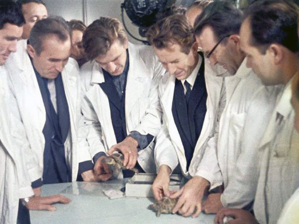 Fig. 10.2.1 : Les deux tortues de Zond-5 après leur retour sur Terre. D'autres tortues ont été embarquées sur Zond-7 et Zond-8 [21]. 10.3. Les expériences de physiqueLes 7K-L1 inhabités ont été équipés de détecteurs permettant d'évaluer le taux de radiations auquel seront soumis les cosmonautes lors du voyage lunaire. Certains disposaient également d'un détecteur de micrométéorites, ainsi que d'instruments destinés à l'étude du Soleil [21]. Notes et bibliographie