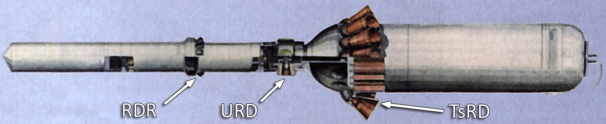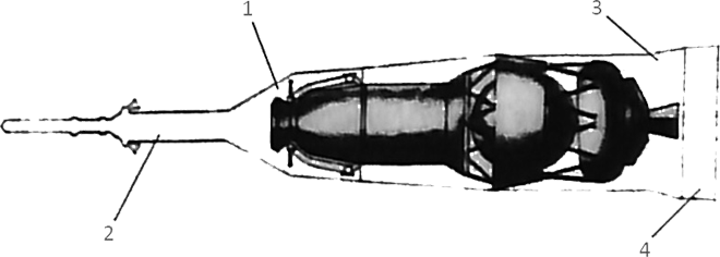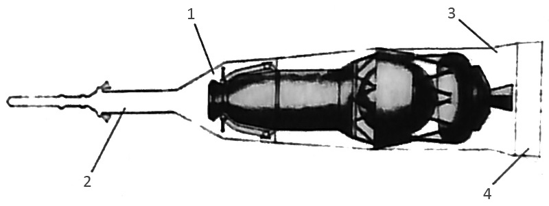 Fig. 2.3.3 : Schéma du profil de rentrée en mode balistique du 7K-L1. 3. MotorisationLe vaisseau 7K-L1 est équipé d'un ensemble moteur KTDU-53 (11D421) destiné à réaliser les corrections de trajectoire entre la Terre et la Lune, ainsi qu'à assurer le freinage avant la rentrée dans l'atmosphère. Il est constitué d'un moteur S5.53 utilisant de l'UDMH comme carburant et de l'AK-27I comme comburant (il s'agit d'un mélange d'acide azotique et de tétraoxyde d'azote). Le S5.53 a une poussée de 410kgf et dispose, en plus de sa tuyère principale, de quatre tuyères verniers qui lui permettent de contrôler l'orientation du vaisseau pendant ses phases de fonctionnement. La masse d'ergols embarquée est de 400kg [7]. Par rapport au vaisseau Soyouz, le 7K-L1 ne possède ni moteur de secours, ni moteurs d'orientation DPO ou DO. 4. Système de sauvetage d'urgenceLe vaisseau 7K-L1 est équipé d'un Système de Sauvetage d'Urgence SAS (Система Аварийного Спасения) qui permet de préserver le Compartiment de Descente et l'équipage en cas d'échec du lanceur Proton-K. Il est constitué d'une tour d'éjection 11D836 fournie par l'usine MMZ Iskra. Elle est dérivée de la tour 11D828 du vaisseau Soyouz [2]. Afin d'assurer la stabilité du vaisseau pendant sa retombée suite à une éjection, la coiffe du lanceur est munie de quatre panneaux cellulaires.