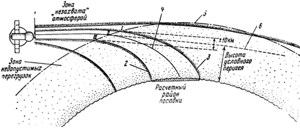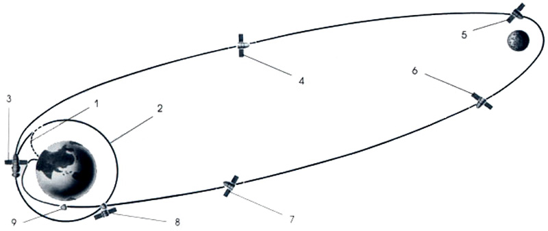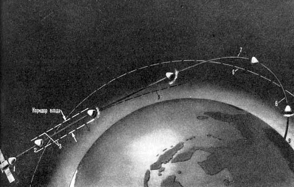 Fig. 2.2.1 : Schéma d'une mission du 7K-L1. Commence alors une phase balistique qui amène le 7K-L1 à contourner la Lune. La distance minimale avec la surface est de l'ordre de 2000km. Une deuxième correction est ensuite réalisée afin d'accélérer vers la Terre, et une troisième permet d'amorcer la rentrée dans l'atmosphère de celle-ci. Le PAO est ensuite largué. 2.3. Le retour sur TerreLe SA aborde l'atmosphère avec une vitesse proche de la deuxième vitesse cosmique (environ 11,2km/s), et il est donc soumis à de fortes contraintes aérodynamiques. Il doit rester à l'intérieur d'un couloir de rentrée compris entre 35km et 55km [15] :