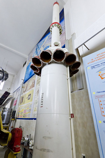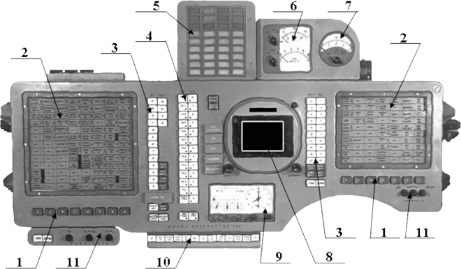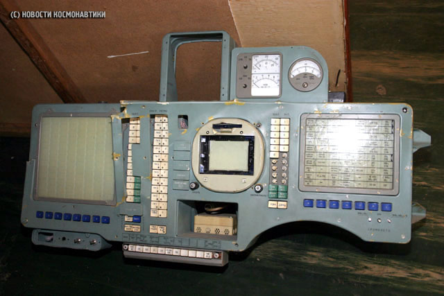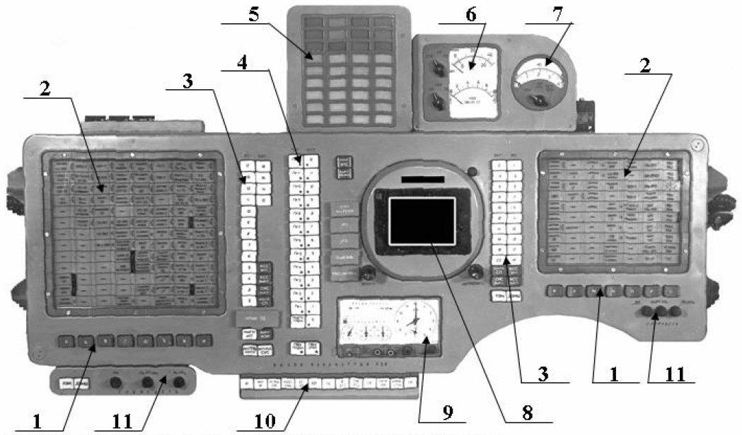 Fig. 7.2 : Un moteur de contrôle du roulis. Le contact avec le sol est amorti par des Moteurs d'Atterrissage en Douceur (DMP) identiques à ceux du vaisseau Soyouz [7]. Leur allumage à quelques dizaines de centimètres du sol est commandé par un altimètre à rayons gamma fourni par le TsNII RTK et dérivé du système Kaktus de Soyouz [7]. 8. Le pupitre de commandeLe Compartiment de Descente (SA) est équipé d'un pupitre de commande appelé Saturn fourni par le SOKB LII qui sert d'interface entre l'équipage et les systèmes de bord [10]. Il est constitué du bloc de boutons de choix du système de contrôle BKS (1), du panneau de signalisation électroluminescent SPE (2), du bloc de boutons des commandes d'alimentation des systèmes BKK (3), du bloc de contrôle des programmes BKP (4), du tableau d'alarmes TSE (5), de l'indicateur de pression et de température IDT (6), de l'indicateur de charge et de courant INT (7), de l'écran KEI (8), de l'horloge BTchK (9), du bloc de choix des paramètres affichés à l'écran (10) et des boutons de réglage du volume (11) [9].