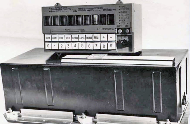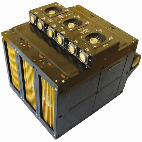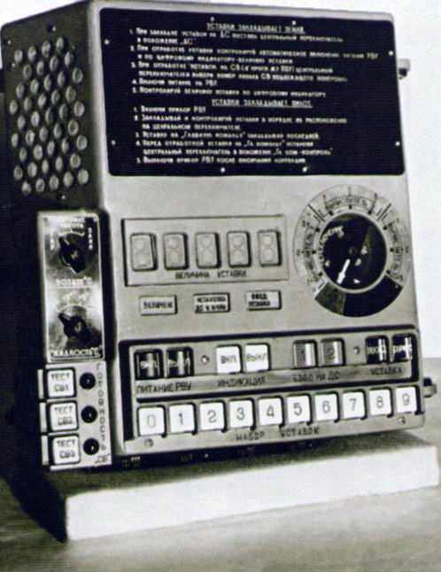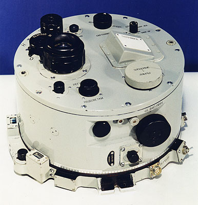 Fig. 9.2.1 : Le sextant Tsiel. 9.3. L'ordinateur Saliout-1Le Saliout-1 (1ST1) est fourni par le NII-335 (aujourd'hui NII Mikropriborov) de Zelenograd. Il a une masse de 15kg, consomme 56W et peut réaliser 500 opérations par seconde [17]. Sa mémoire contient les caractéristiques de 514 étoiles de magnitudes inférieures ou égales à 4. A partir des données relevées par l'équipage à l'aide du sextant, le Saliout-1 détermine les paramètres de l'orbite du vaisseau en utilisant la méthode de Encke [14]. Une fois que l'ordinateur Saliout-1 a déterminé les paramètres de la correction d'orbite à réaliser, ils s'affichent sur le panneau d'indication (1ST2). L'équipage doit alors les recopier manuellement sur le Pupitre de Saisie Manuelle des Paramètres PRVU (Пульт Ручного Ввода Установок), développé au TsKBEM sous la direction de Nikolaï ROUKAVICHNIKOV, futur cosmonaute [17]. Le PRVU permet de rentrer les paramètres de la correction dans l'ordinateur Argon-11S du Système de Contrôle du vaisseau. 10. Contenu scientifiqueLes vols d'essais inhabités du 7K-L1 ont été l'occasion de faire voler plusieurs instruments scientifiques. 10.1. Les appareils photosLes vaisseaux 7K-L1 ont été équipés de plusieurs appareils photos, qui n'ont vraisemblablement pas tous été embarqués sur chaque vol. L'appareil photo AFA-6A, fourni par l'usine KMZ de Krasnogorsk [18] a volé plusieurs fois. De même, l'appareil BAF-40KM, fourni par le MIIG AiK, a volé au moins sur Zond-6 et Zond-8. Il est dérivé du BAF-40 de KMZ qui était utilisé sur les avions de reconnaissance. Sur le 7K-L1, il réalise deux séances à chaque vol : une pour la face cachée, et une avec l'horizon lunaire et la Terre au loin [19]. Par ailleurs, l'usine TsKB Arsenal de Kiev fournit aussi l'appareil SKD [20]. Si un équipage avait volé sur le 7K-L1, il aurait été équipé de l'appareil photo Saliout-1M muni d'un objectif Taïr-33S, ainsi que d'une caméra vidéo 16LK-K1, tous fournis par KMZ. 10.2. Les expériences biologiquesLe vaisseau Zond-5 a emporté deux tortues de Horsfield de 40 grammes chacune, ainsi que plusieurs centaines de mouches, des œufs de mouches Drosophilidae, des ténébrions meuniers (un coléoptère), des salades, des algues et des bactéries [21].