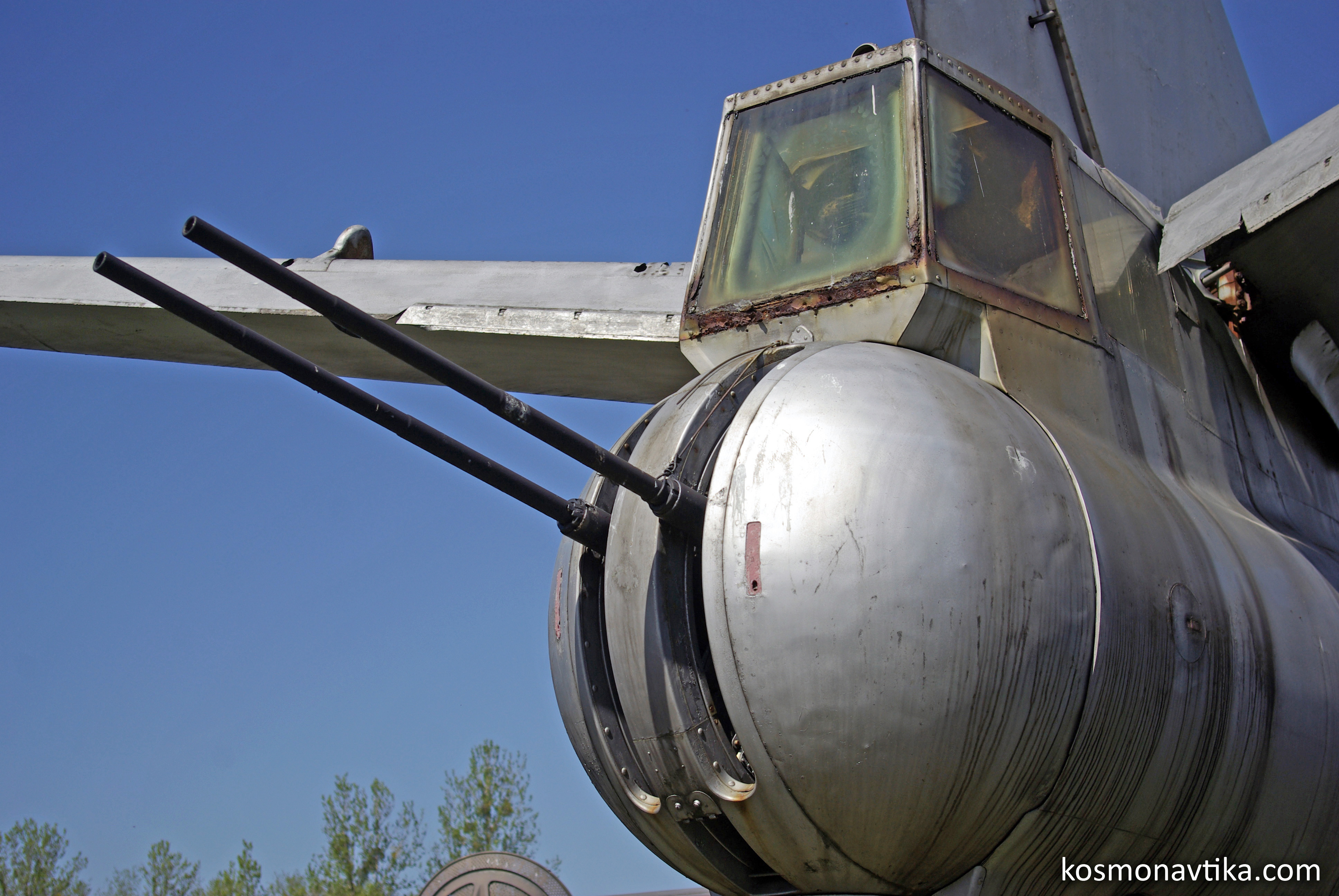 Fig. 1.1 : Deux canons NR-23 à l'arrière d'un Il-28. Le canon n'a été testé qu'une seule fois dans l'Espace. C'était le 24 janvier 1975, depuis la station Saliout-3 alors inhabitée. Les cartouches tirées ce jour là sont rentrées dans l'atmosphère avant la station elle-même, qui arrivait à la fin de son exploitation. La station suivante, Saliout-5, n'a pas été équipée de canon [2]. 2. Le système Chtchit-2Un autre système d'armement, baptisé Chtchit-2, a été développé pour les stations Almaz, lui aussi fourni par le KB TotchMach [1]. Il est constitué de deux missiles à propergols solides espace-espace [3]. On ne sait rien sur ce système, mais il n'a a priori jamais volé. Bibliographie