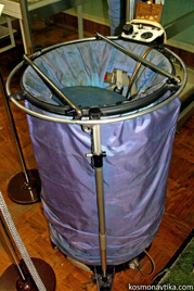Almaz | Systèmes de vie1. Recyclage de l'eauLes stations Almaz sont équipées du système de recyclage de l'eau Priboï-101, fourni par le NII KhimMach de Moscou [1][3]. L'eau est ensuite stockée grâce au système Koloss-5D, dérivé de celui qui équipe les vaisseaux Soyouz. 2. Système de vieLe système de vie des stations Almaz est fourni par l'usine Zvezda de Tomilino [1]. Il inclut également un système de régulation de température STR (Система Терморегулирования) et un système de contrôle de l'atmosphère SNIR (Система Наддува и Разгерметизации), tous deux fournis par l'OKB Nauka de Moscou [1][2]. La pression dans la station doit être comprise entre 700mmHg et 960mmHg (valeur nominale : 760mmHg). La pression partielle en oxygène doit être comprise entre 140mmHg et 280mmHg, et la pression partielle en gaz rares doit être inférieure à 10mmHg [4]. 3. Santé de l'équipageLes cosmonautes disposent à bord d'un tapis roulant pour maintenir leur masse musculaire, ainsi que d'une chambre à vide qui leur permet, au cours de séances régulières, de faire circuler leur sang dans la partie basse de leur corps.