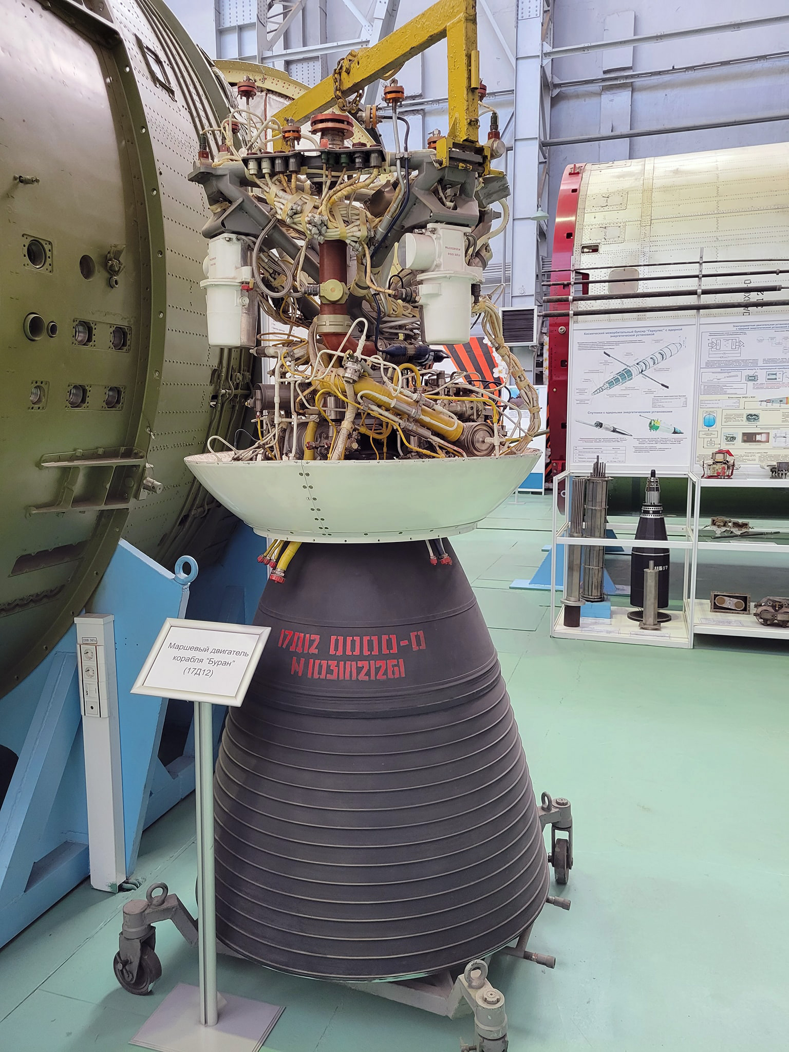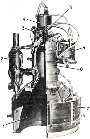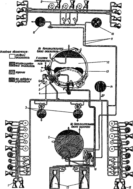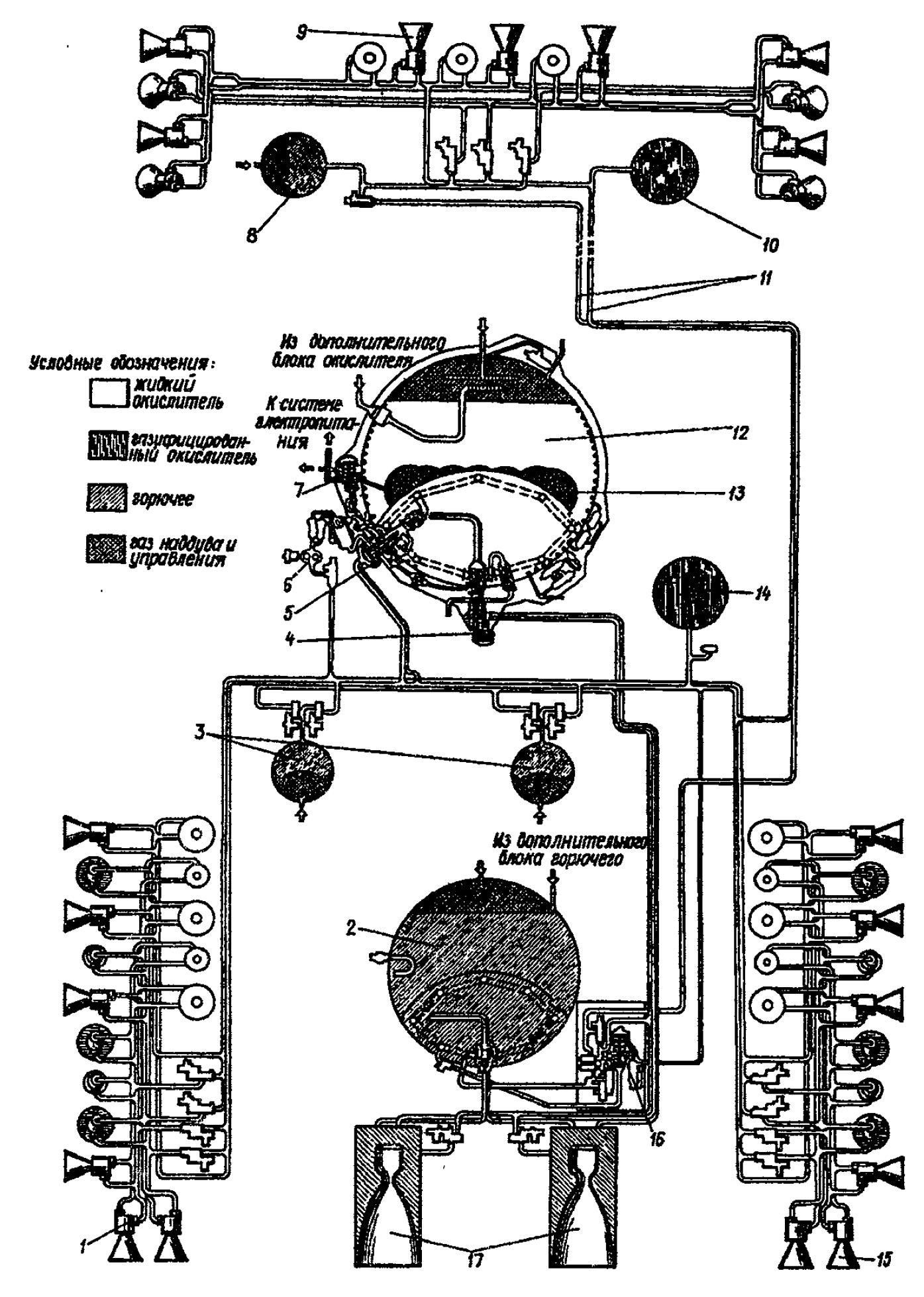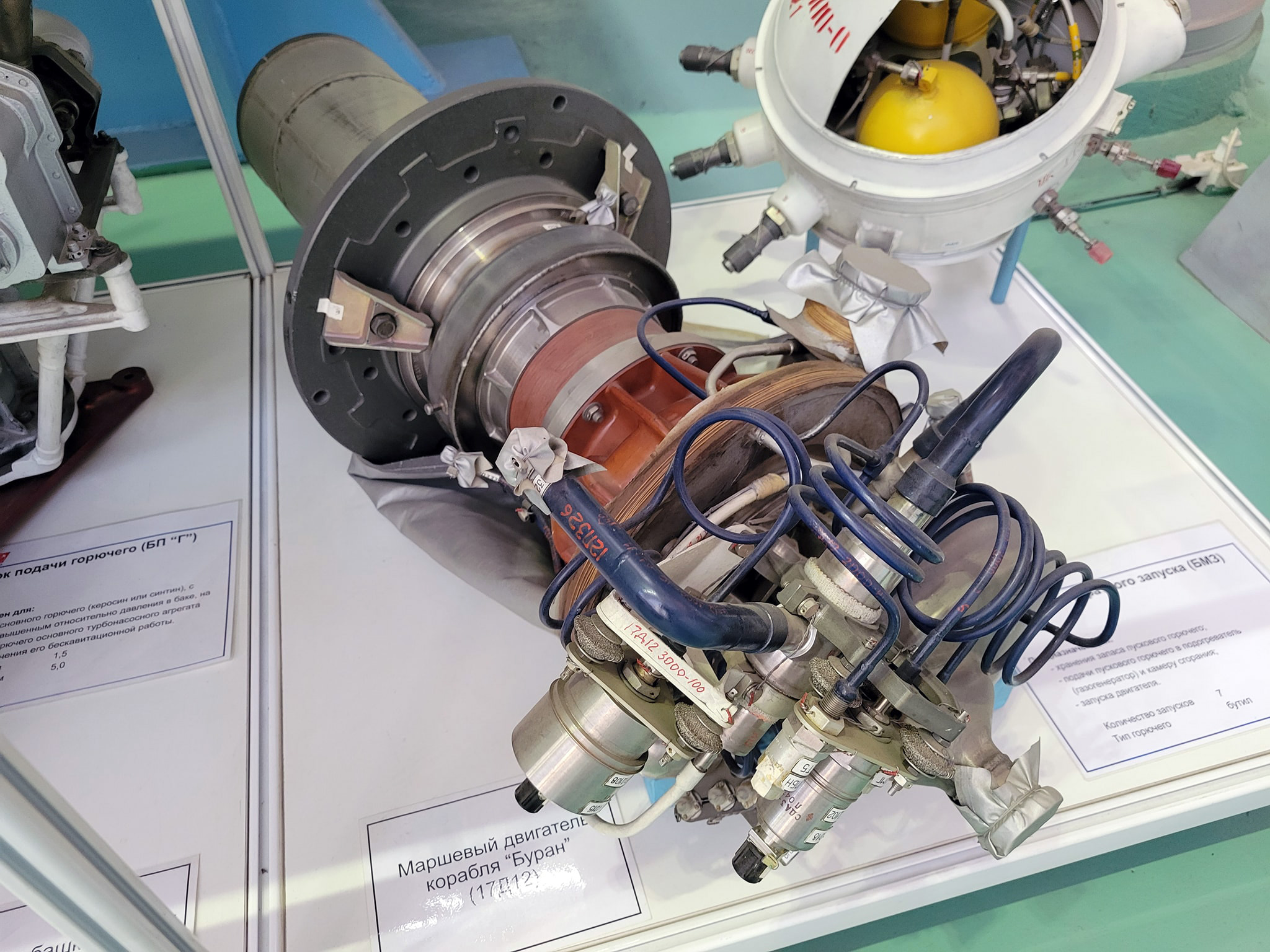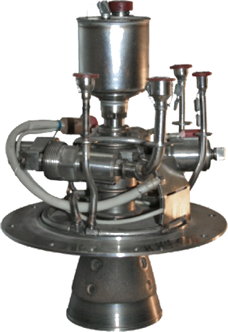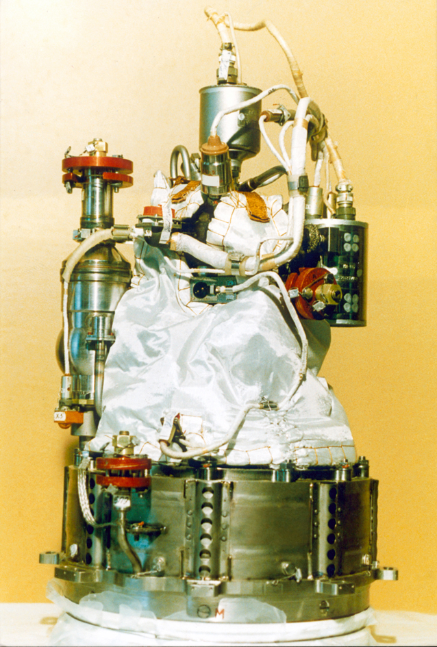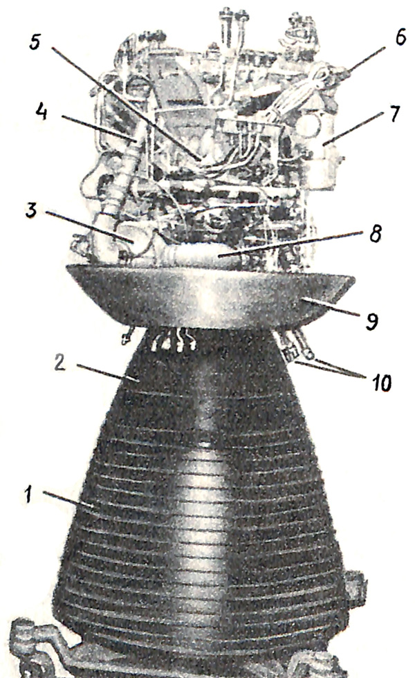 Fig. 3.1.1 : Le moteur 17D12. L'allumage des ergols, que ce soit dans le générateur de gaz ou dans la chambre de combustion, est réalisé par un composé organométallique, le triéthylaluminium (TEA), qui est stocké dans le Bloc d'Allumages Multiples BMZ (Блок Многократного Запуска) [1][4].