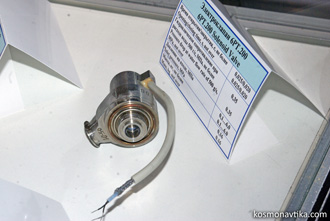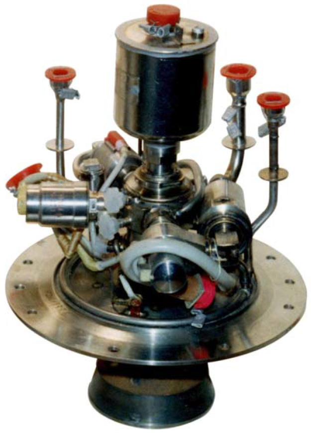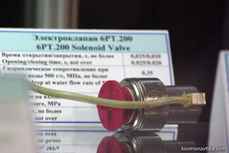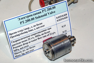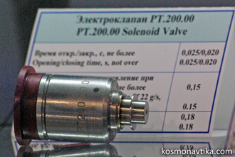 Fig. 3.2.1 : Le moteur 17D15. Ils peuvent ainsi être utilisés en redondance des autres types de moteurs, aussi bien les DO que les DOM. Ce sont les quatre moteurs dirigés vers l'arrière qui servent de redondance aux DOM, et ils bénéficient d'une tuyère allongée afin d'augmenter leur rapport d'expansion (F=50) et ainsi gagner en impulsion spécifique [1]. L’allumage est assuré par un système électrique à induction. Le refroidissement de la chambre et de la partie supérieure de la tuyère est régénératif, à travers un film d'oxygène gazeux. La partie basse de le tuyère, quant à elle, est refroidie uniquement par radiation [1]. Le moteur atteint 90% de sa poussée nominale en 0,06". Il est conçu pour 26000 allumages et au minimum trois heures de fonctionnement cumulé. Quand il fonctionne en mode impulsionnel, son impulsion spécifique est de 180" [1]. 3.3. Les moteurs d'orientation fine (DO)Bourane est équipée de huit moteurs d'orientation fine, parfois appelés simplement moteurs d'orientation, ou DO (Двигатель Ориентации). Ils sont tous situés dans les deux Bloc Moteur de Contrôle latéraux (BDU-L et BDU-P) et sont de type 17D16, fournis par le NII Mach. Ils fonctionnent avec le mélange sintine et oxygène gazeux et fournissent une poussée de 196,1N avec une impulsion spécifique comprise entre 227" et 237". Ils sont optimisés pour donner des impulsions de 0,06" à 0,12", mais peuvent fonctionner en continu pendant 100". Ils peuvent être allumés jusqu'à 5000 fois par vol, et au total 40000 fois [3]. Une tête de mélange précède la chambre de combustion. La sintine y est admise par la vanne RT.200.00-01, développée en interne par le NII Mach. C'est une vanne électromagnétique tout-ou-rien monoétage dotée d'un joint en polytétrafluoroéthylène (PTFE). Elle a une masse de 0,18kg, un temps de manœuvre de 0,03" et consomme 0,74A sous 34V à une température de 20°C [3]. L'oxygène gazeux est admis dans la tête de mélange par la vanne électromagnétique 6RT.200.00-03, également développée par le NII Mach. C'est une vanne à deux étages avec un joint en PTFE. Elle a une masse de 0,16kg, un temps de manœuvre de 0,025" et consomme 0,16A sous 34V à une température de 20°C [3]. Après avoir été mélangés dans la tête de mélange, les ergols rejoignent la chambre de combustion où ils sont allumés en 0,120" par un système qui consomme moins de 1A [3]. Le rapport de mélange est de 3,5 à 4,0, c'est-à-dire que le mélange est riche en oxygène [1]. Le refroidissement de la tuyère est assuré par un film de sintine [3].