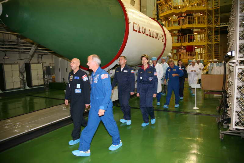 L'équipage observe son lanceur Soyouz-FG en préparation