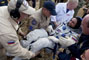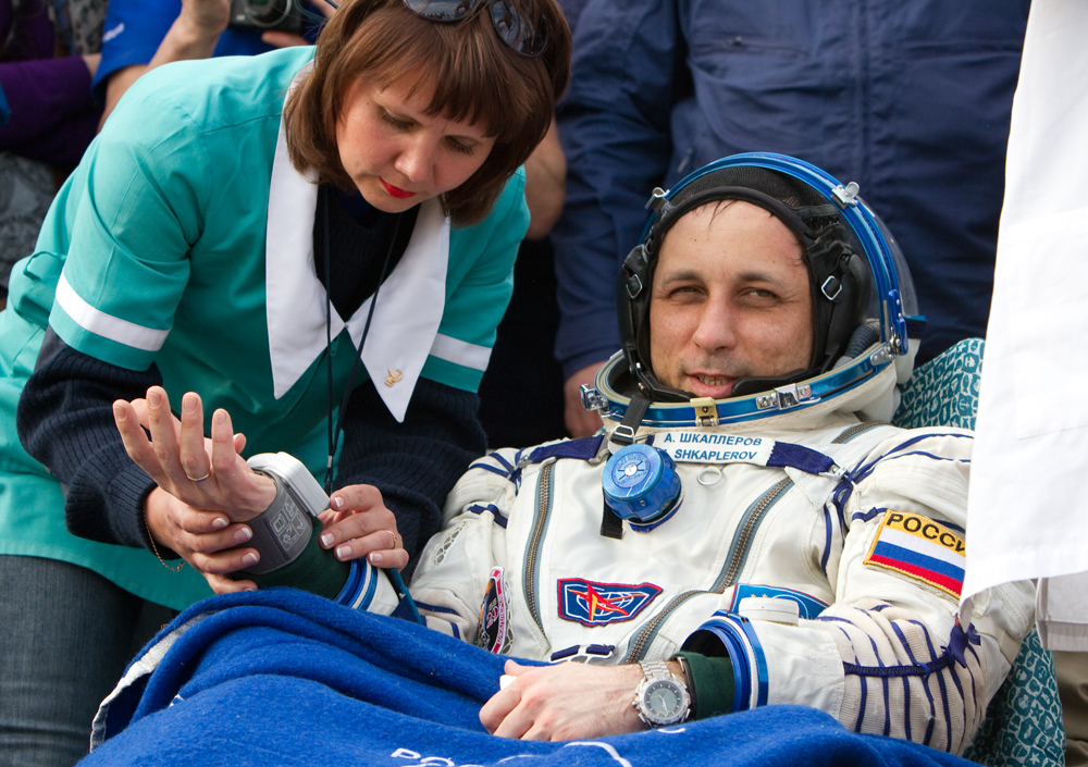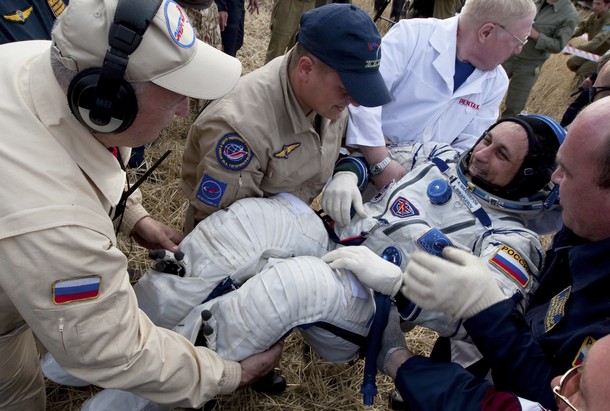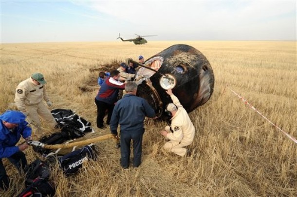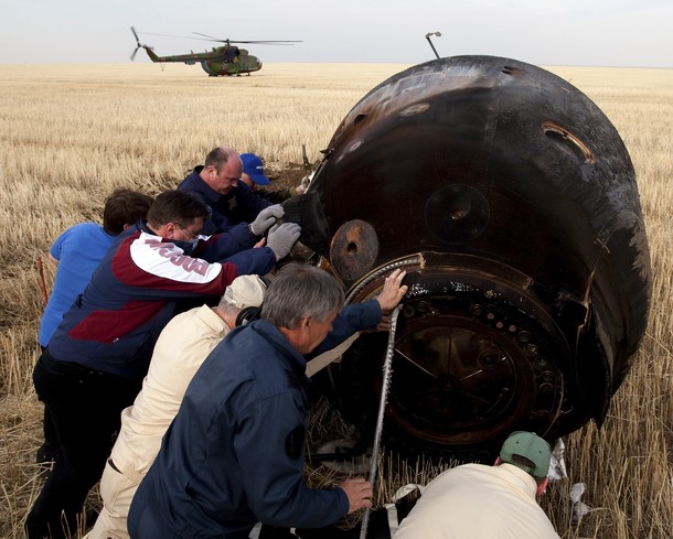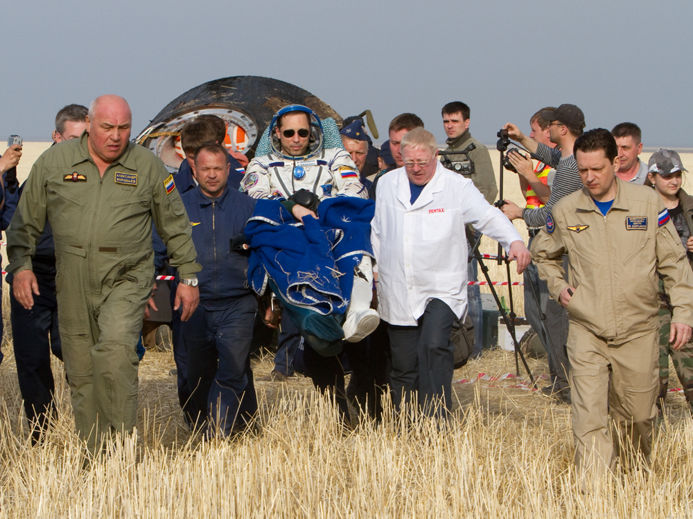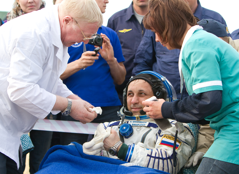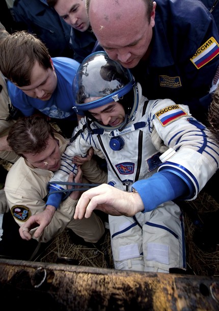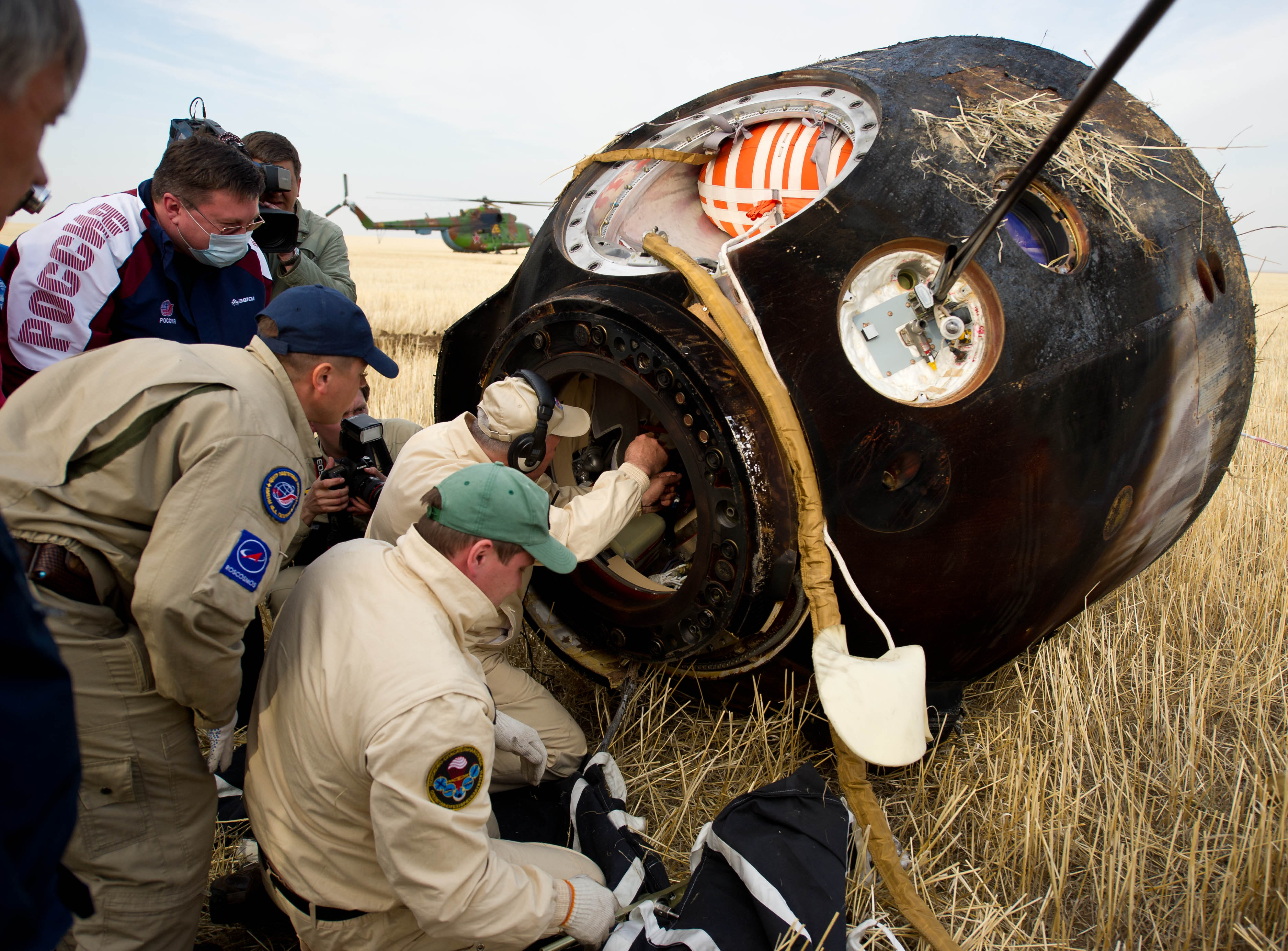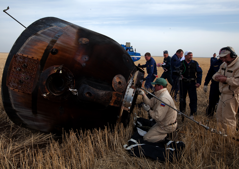 MKS-30 | Soyouz TMA-22A bord du SA, 19 avril 2012 : A bord du SA, 23 avril 2012 : Les hélicoptères prêts à décoller, 27 avril 2012 : Soyouz TMA-22 se sépare de Poïsk, 27 avril 2012 : Atterrissage de Soyouz TMA-22, 27 avril 2012 : Les équipes de récupération ouvrent l'écoutille : Les trois cosmonautes à bord du SA : Les cosmonautes sont extraits du SA : Les cosmonautes se reposent quelques instants : Les cosmonautes sont transportés vers l'hôpital de campagne : Les cosmonautes sortent de l'hôpital de campagne et partent à Koustanaï :